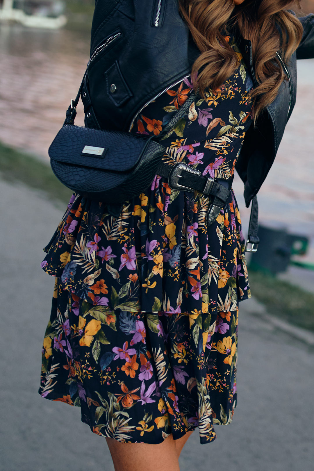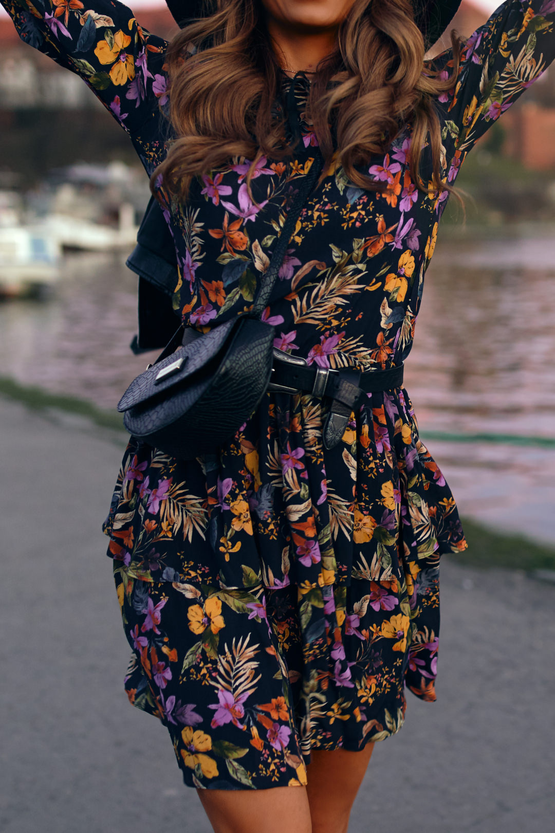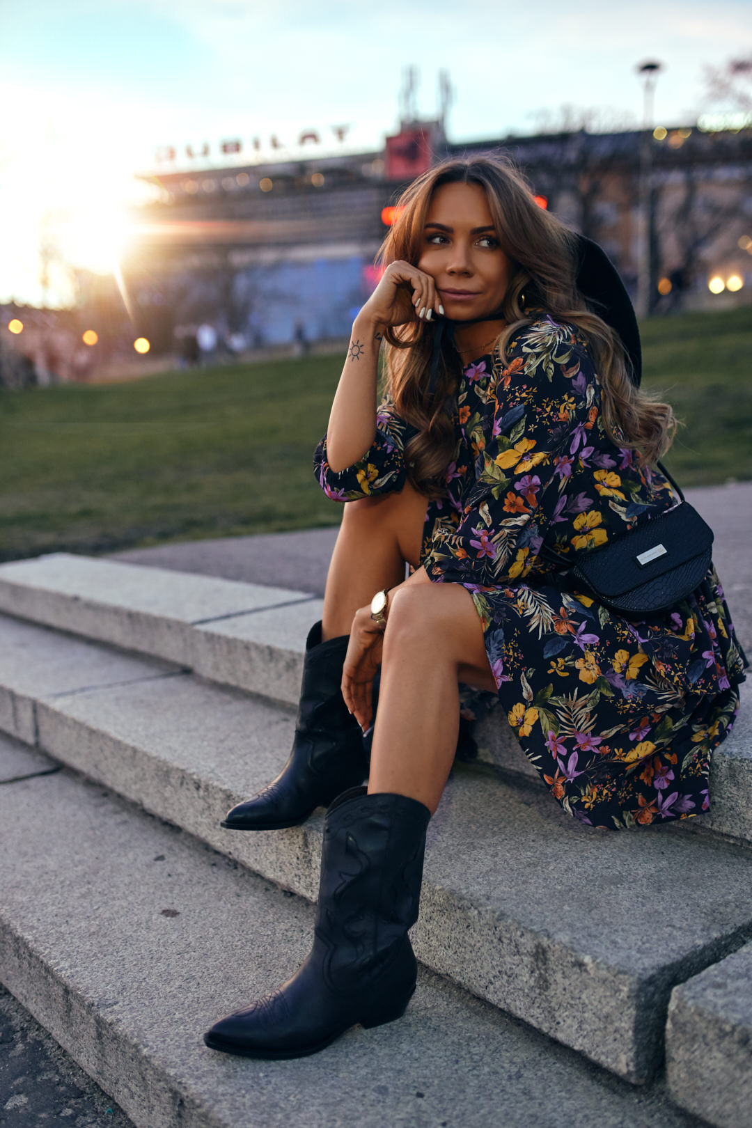 Dziś mam na sobie piękną sukienkę w kwiaty, dziewczęca, wiosenna, idealna na aktualną porę roku. Dzięki temu, że jest do kolana jest też idealnym rozwiązaniem dla tych z Was, które nie lubią nosić mini, dla tych z Was, które są wyższe, albo tak jak ja po prostu lubią taką długość. Fajnie wygląda do najmodniejszych butów w tym sezonie, czyli kowbojek, ale równie dobrze pasuje z trampkami.