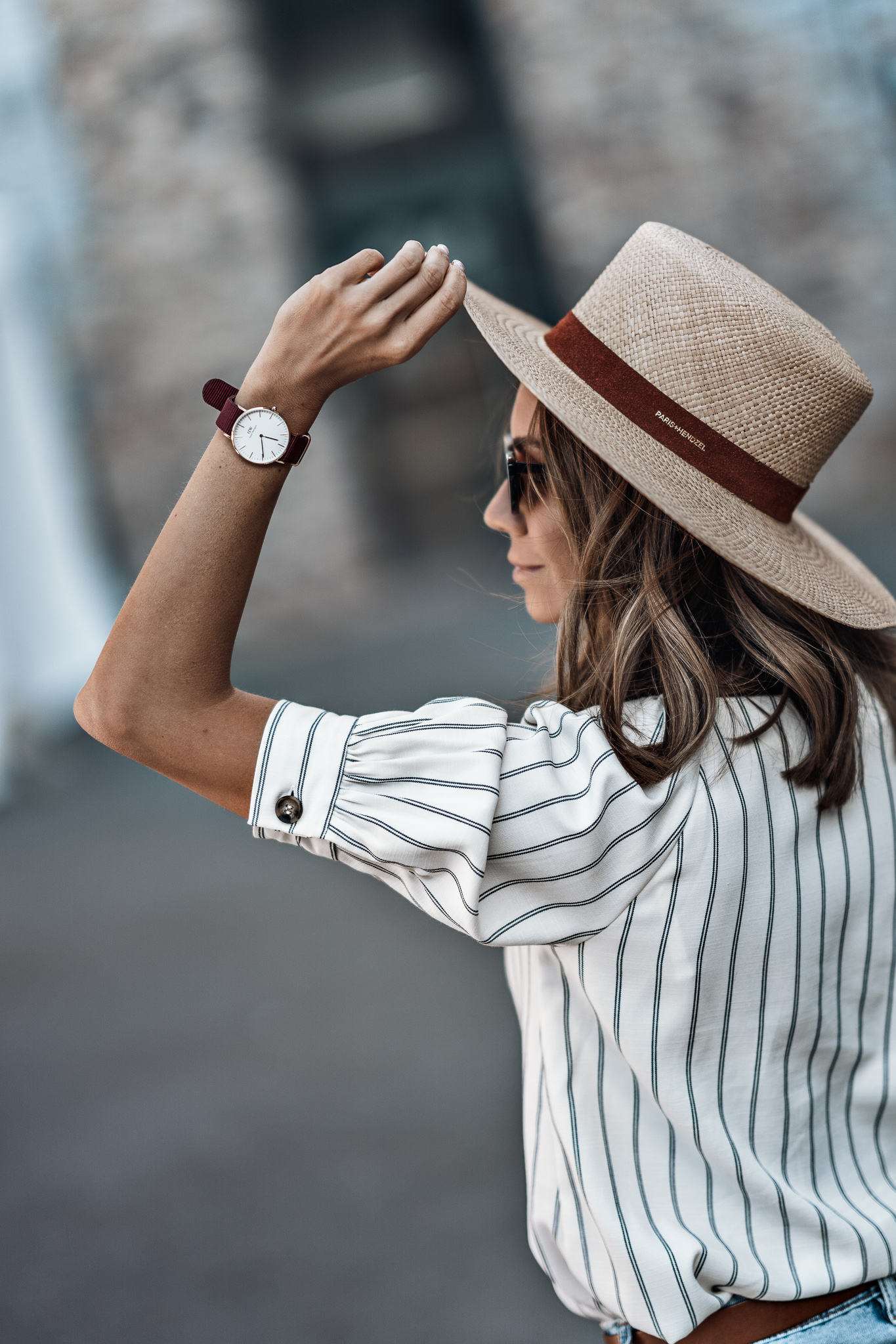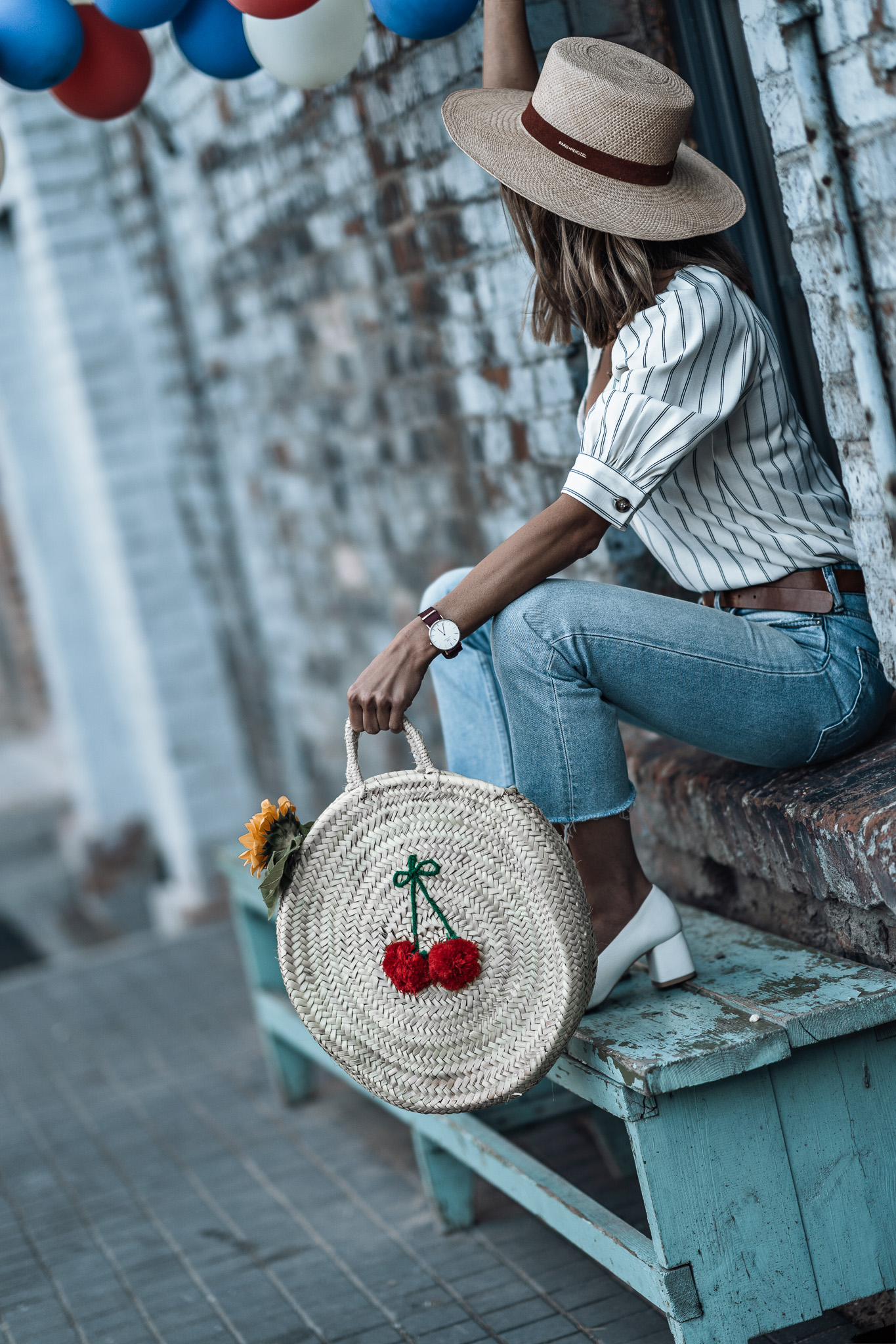 Wspaniały image, denim Tobie świetnie pasuje i bardzo twarzowo wyglądasz w kapeluszu 🙂 Koszula jest tutaj moim zdecydowanym faworytem, bo jest w modne paski. W obu stylizacjach bardzo ciekawa odmiana torebki z wyszytą przeuroczą wręcz wiśnią 😀