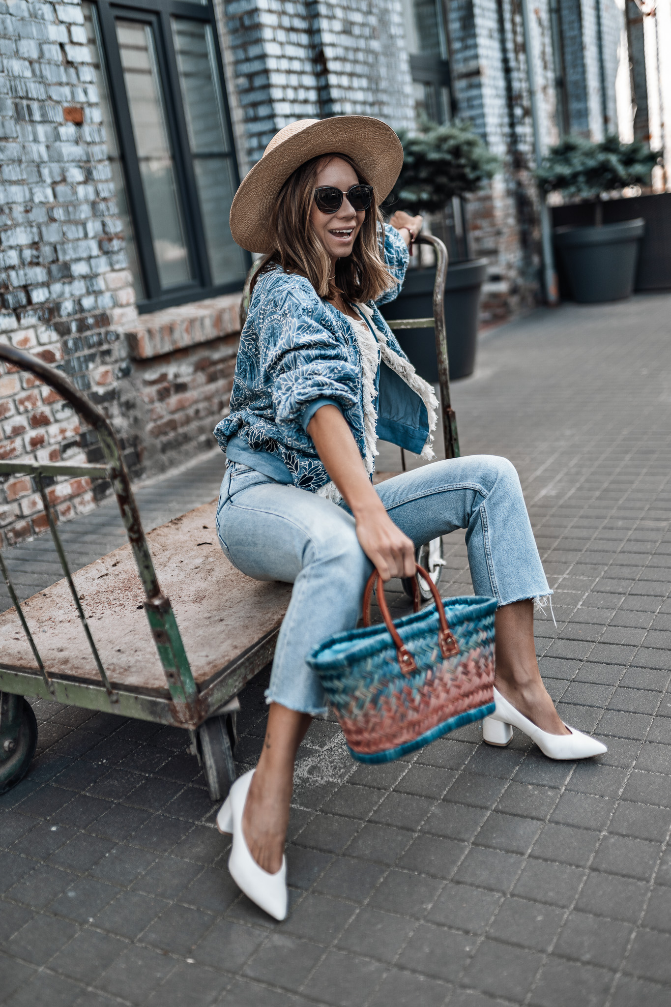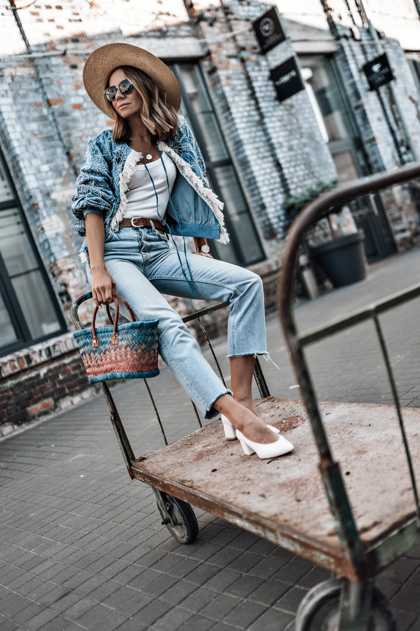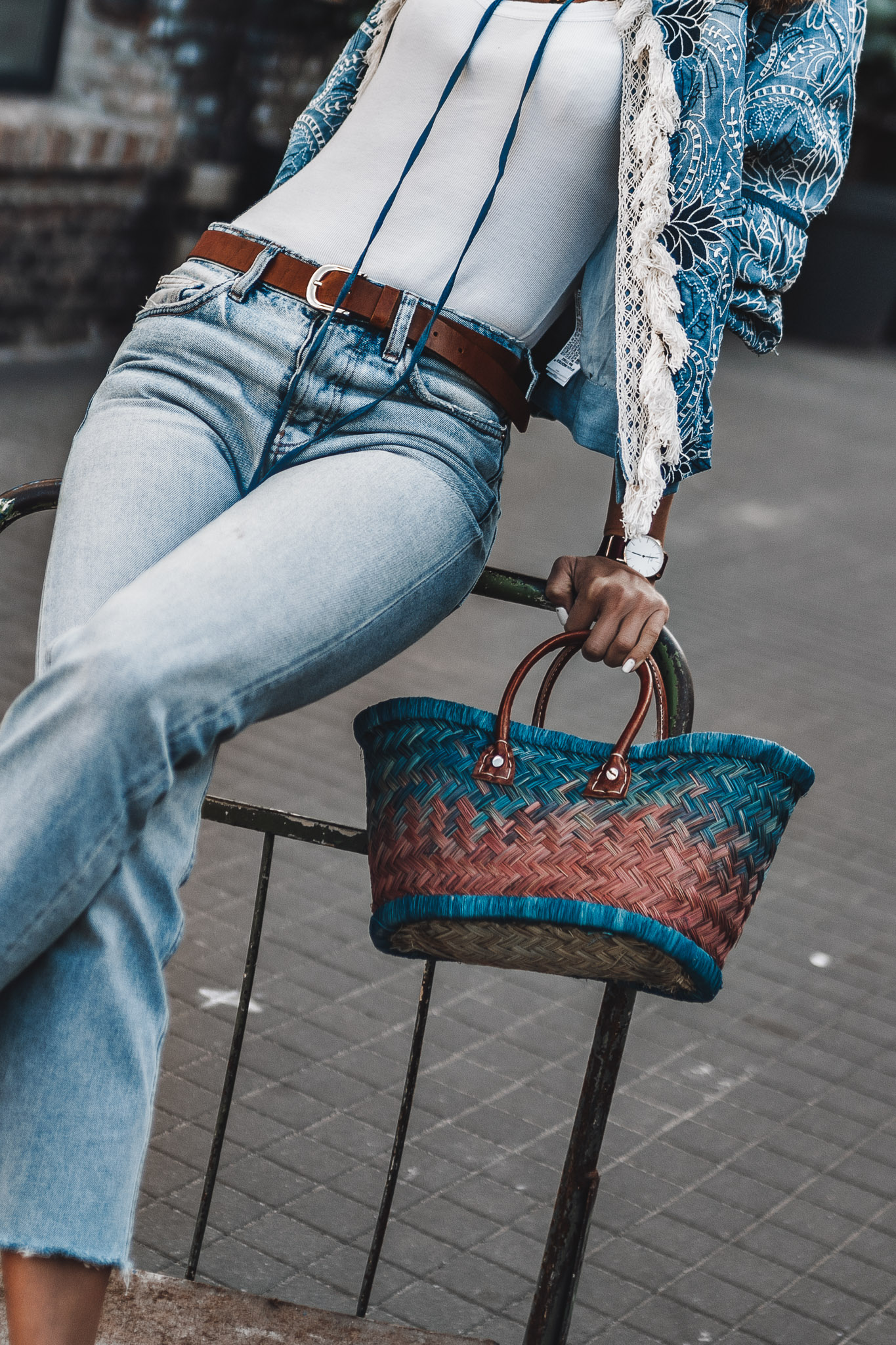 Połączyłam tu najgorętsze dodatki sezonu z klasyką i klimatem lat 70-tych. Dżinsy, celowo mają długość do kostki, taka długość sprawia, że dżinsowe spodnie wyglądają na lżejsze i bardziej letnie. Bluzeczka, to taki krój i materiał z lat 70-tych, moja mama gdy ją zobaczyła, stwierdziła, że miała niemal identyczną, wielka szkoda, że nie zostawiłam swojej garderoby z lat młodości.
