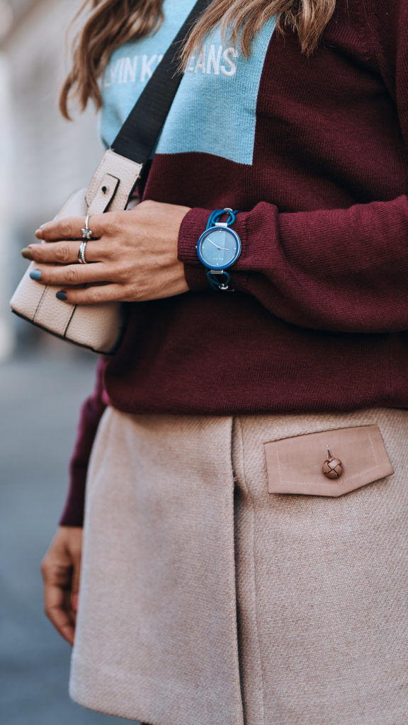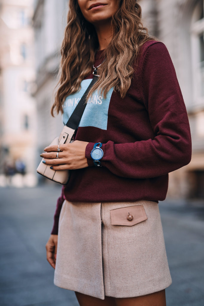 Dla mnie idealnym połączeniem z kolorem bordowym będzie krem i niebieski, tak, aby w naszej stylizacji coś się zadziało i nie było nudy. Również dlatego, żeby odejść trochę od klasycznych połączeń bordo plus szarości, chociaż nie mówię, że one wyglądają źle. Zobaczcie jak zmienia się nam całość gdy dosłownie wpleciony zostaje mały niebieski akcent. Do mini spódniczki możecie również wybrać wysokie kozaki, świetnie będą pasować. Na głowie czapka lub kapelusz dla tych z Was, które są bardziej odważne.