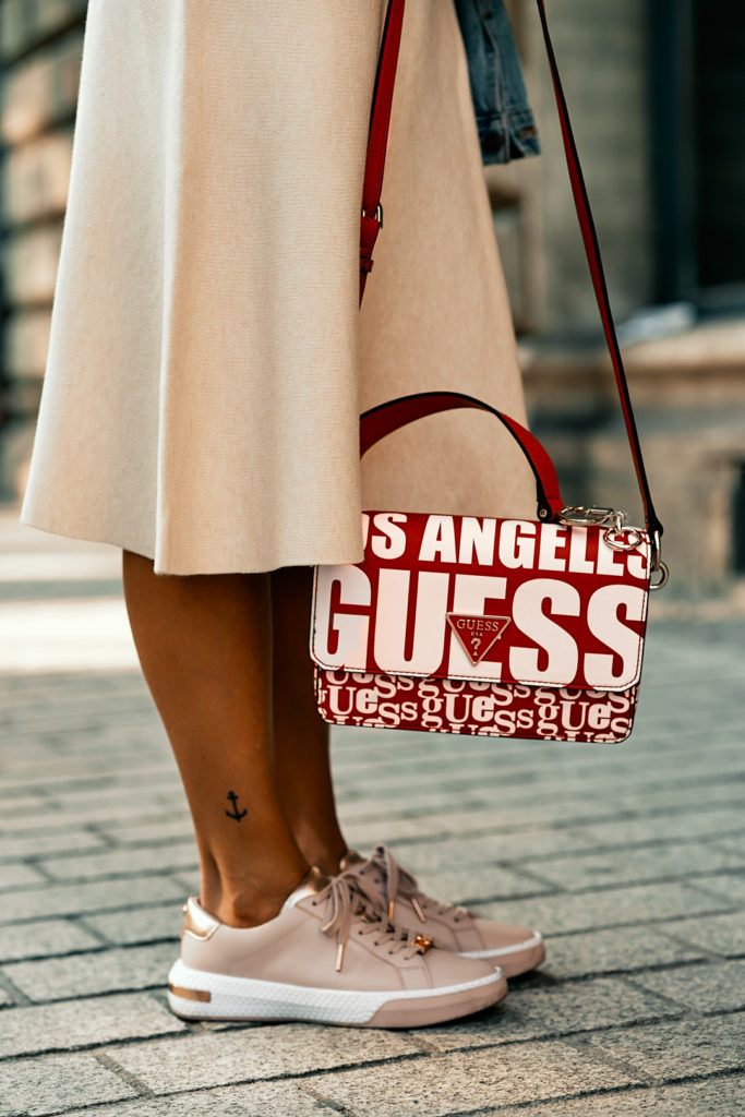 Połączenie idealne, barwy, które pięknie się uzupełniają, stonowany krem i przebojowa czerwień stworzy nam stylizacje obok której nie da się przejśś obojętnie. W przypadku tego połączenia uznałam, że najlepiej postawić na wygodne sneakersy. Uzupełnieniem jest chustka we włosach, która oryginalnie dołączona była jako element ozdobny torebki. Moim zdaniem na włosach wygląda ciekawiej.