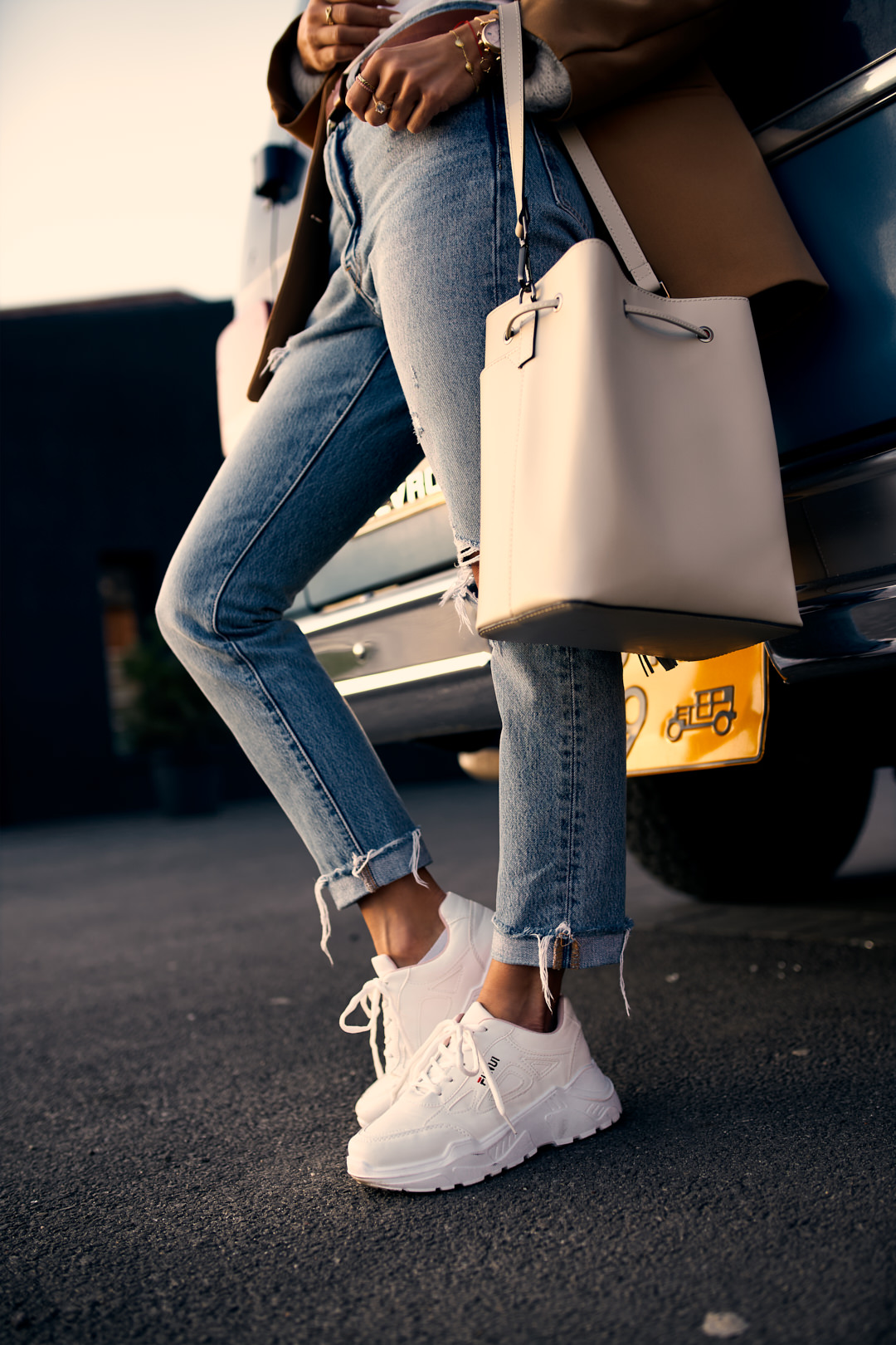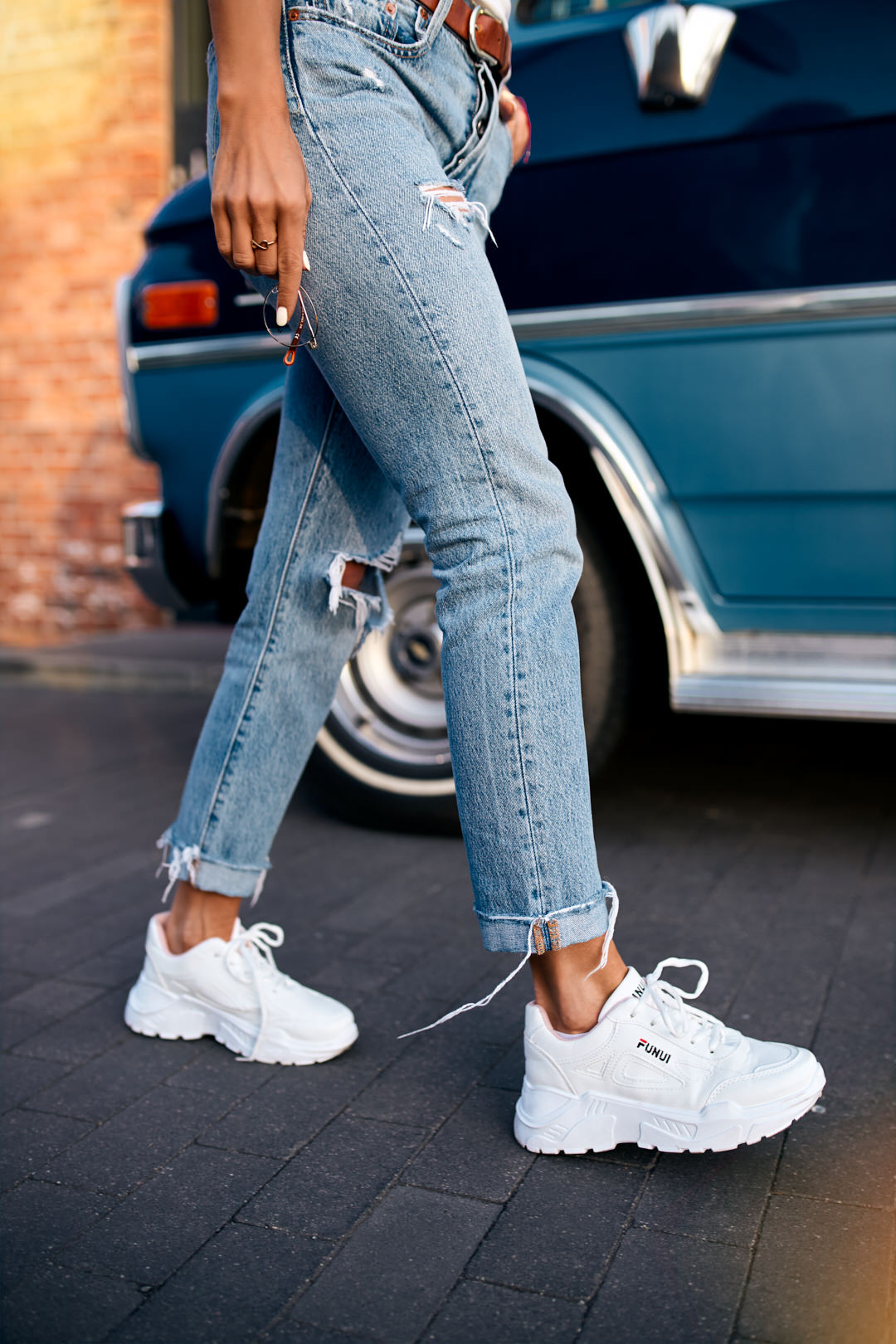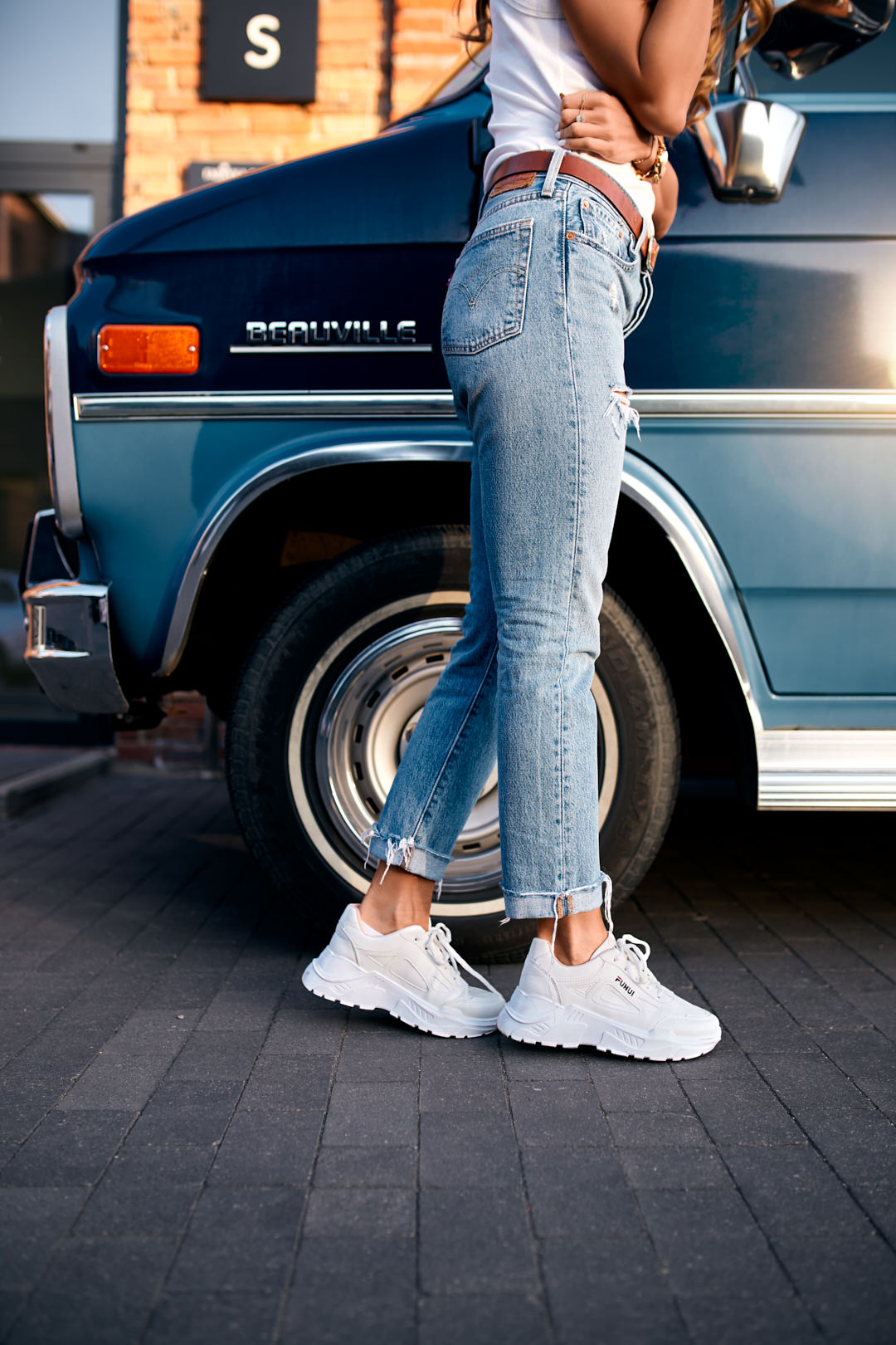 Na zdjęciu widzicie klasyki 501 od Levi’s tym razem w wersji z dziurami, prążkowany top, białe, kultowe adidasy i marynarkę w stylu oversize.