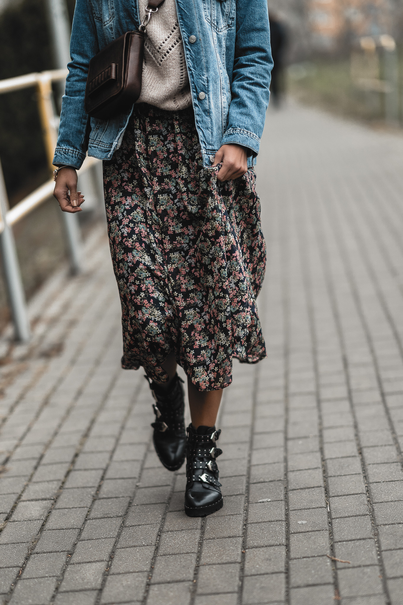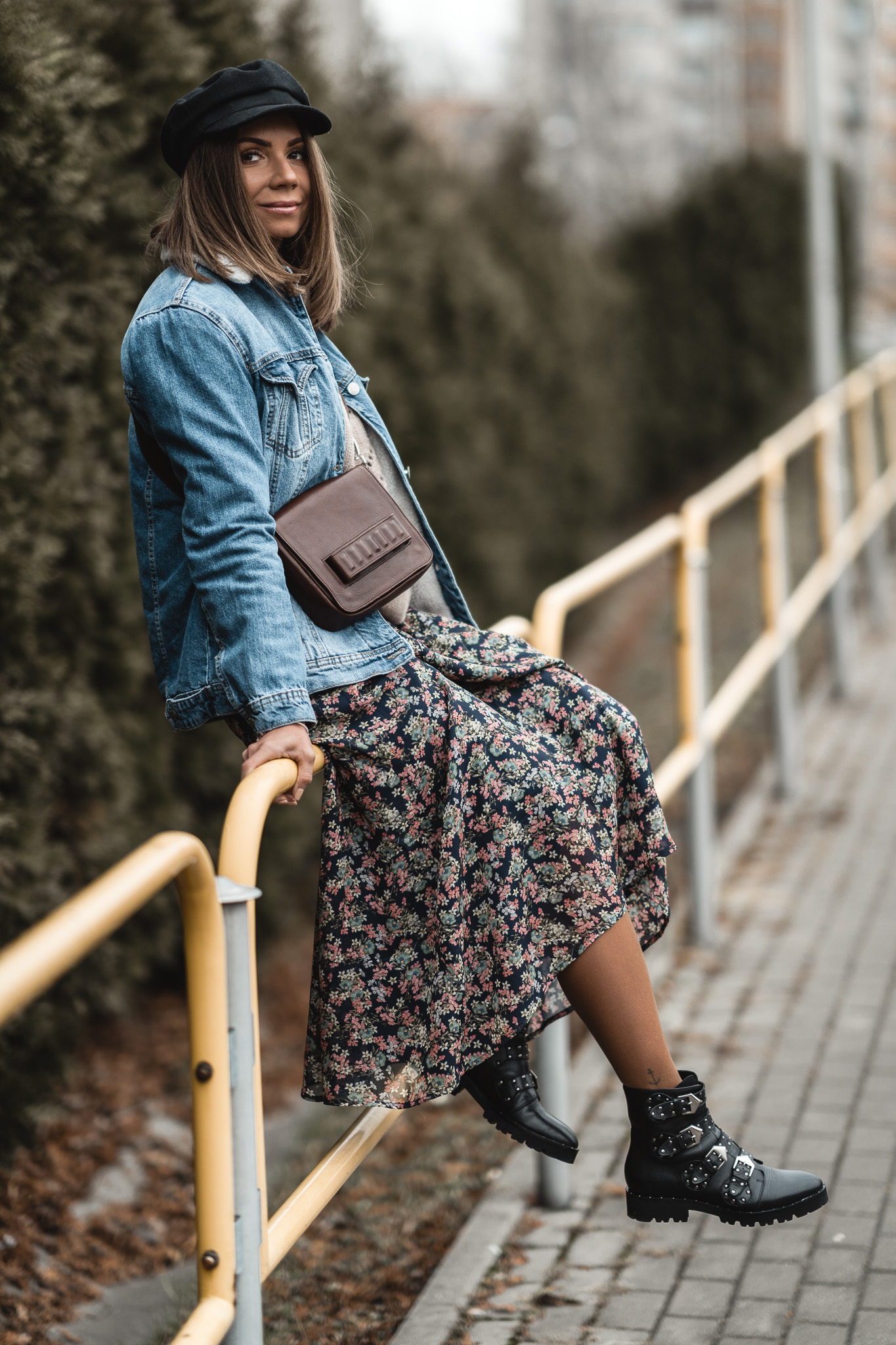 Było przyjemniej staram się, aby moje stylizacje były radosne dla oka. Tak jak ta dzisiejsza, przepiękna, długa sukienka w kwiaty. Świetnie komponuje się z dżinsowymi kurtkami i skórzanymi ramoneskami. Jak widzicie katana jest w wersji zimowej. Ma podszewkę z futerka, a rękawy posiadają dodatkowe podszycie.