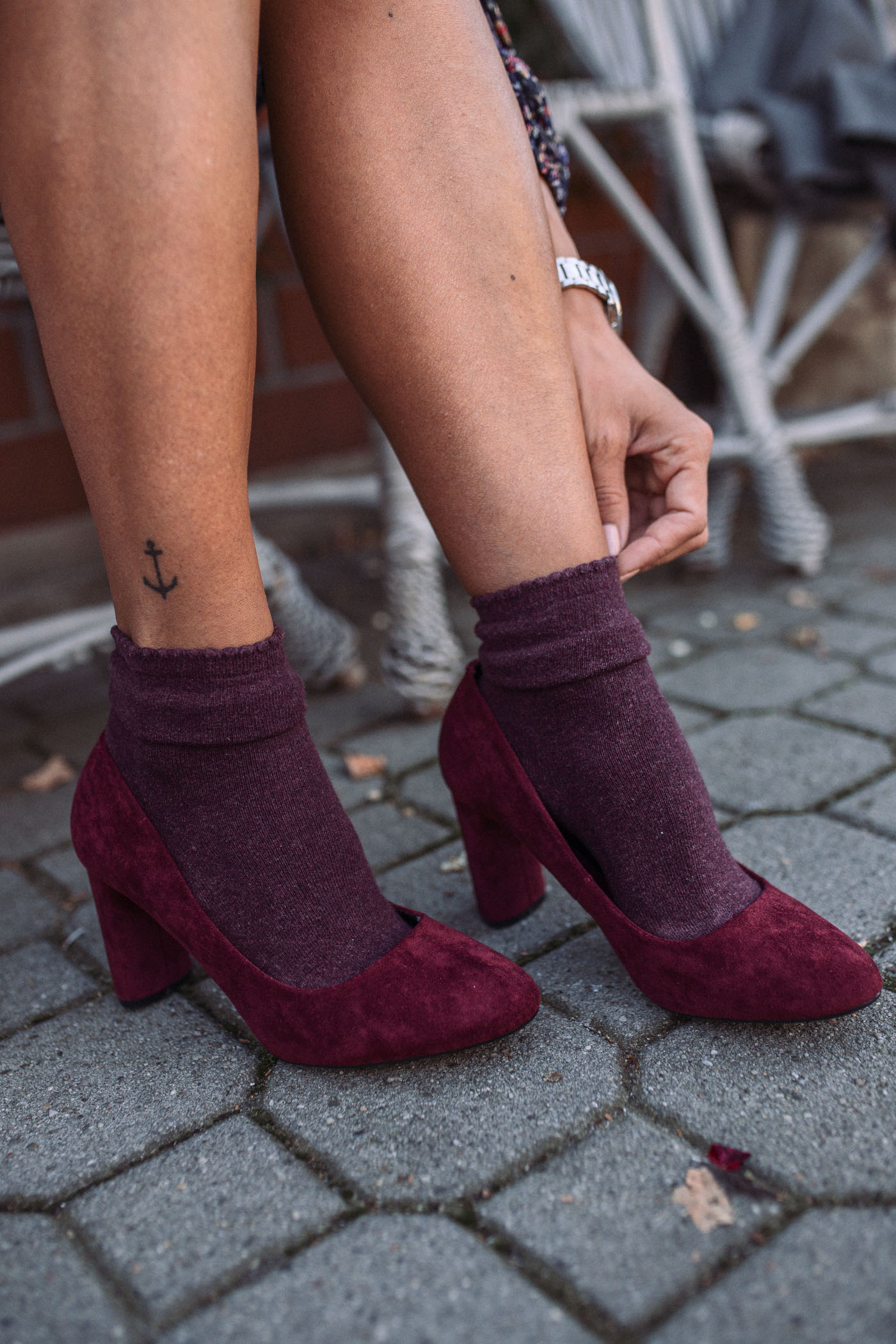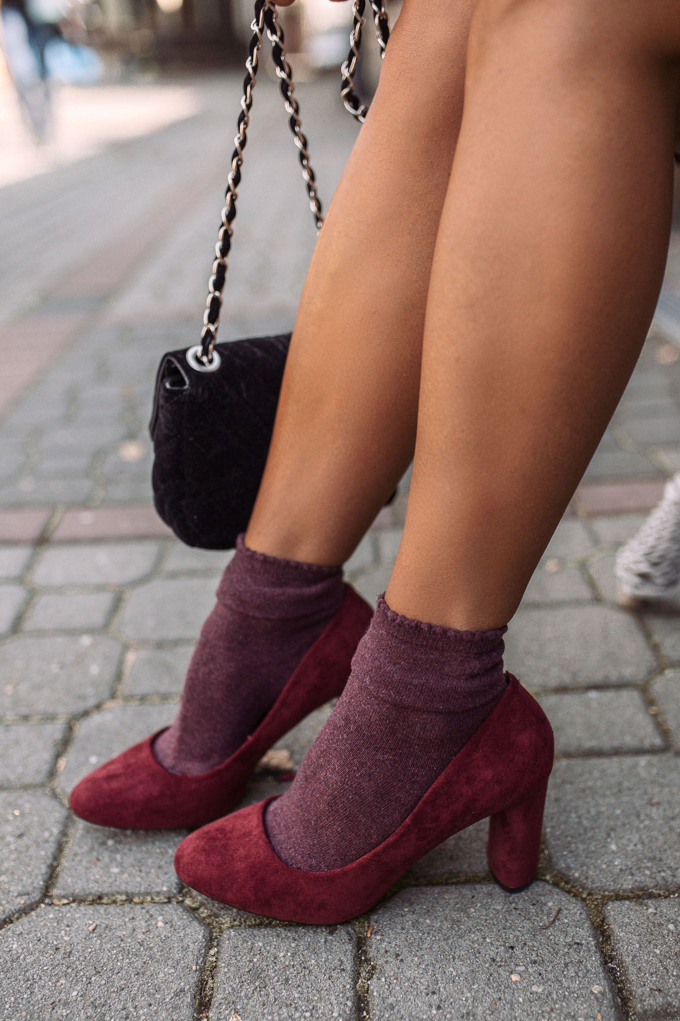 Do dziewczęcej i niezwykle uroczej sukienki dobrałam bordowe czółenka na grubym obcasie, dzięki temu mój zestaw, nie tylko jest kobiecy, ale również wygodny. Do butów założyłam grube, bawełniane skarpetki, wiem, że dla niektórych z Was jest to wciąż połączenie dziwne, ale spróbujcie się do niego przekonać, myślę, że warto 🙂