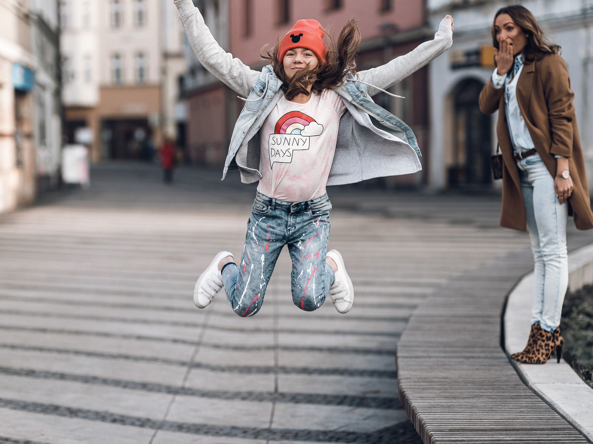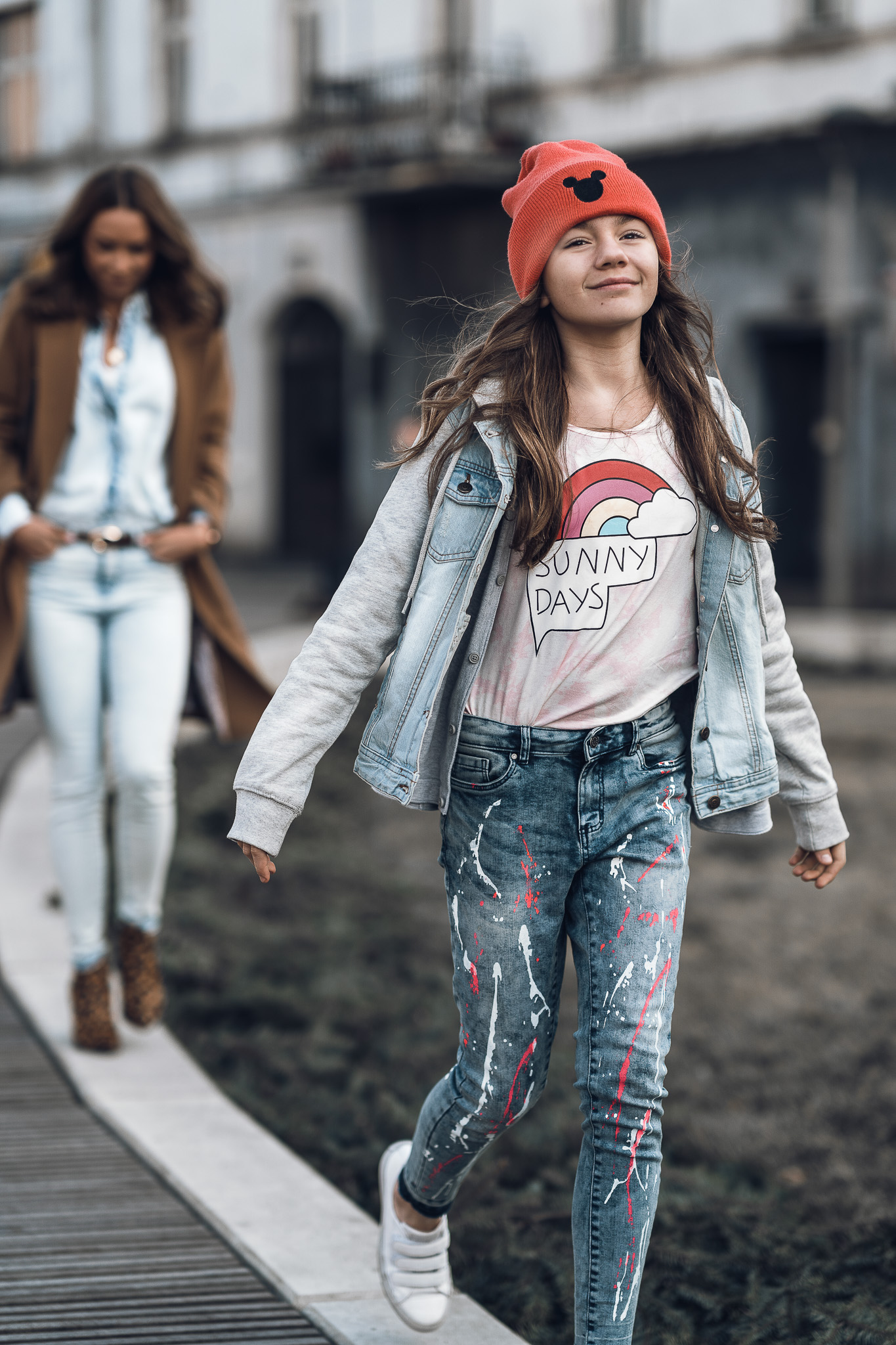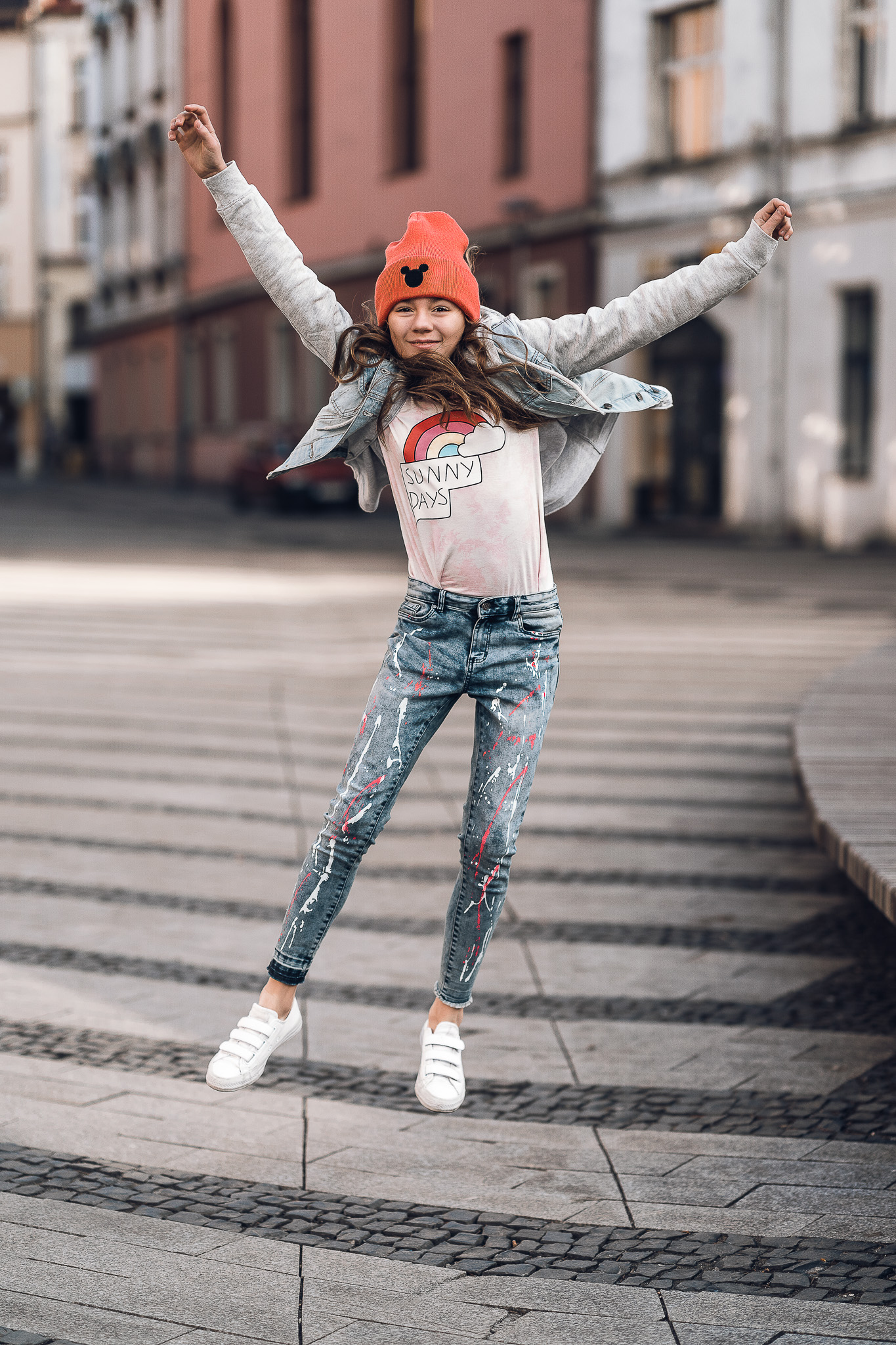 Olivce w nowej kolekcji „Let’s Denim” najbardziej spodobały się wystrzałowe dżinsy, skrapiane farbą. Dzięki wygodnej gumce w pasie i regulacji szerokości można idealnie dopasować rozmiar do dziecka. Poza tym spodnie są wyjątkowo miękkie, a dzięki temu bardzo wygodne. Do dżinsów dobrałyśmy pozytywną koszulkę w delikatnym odcieniu pudrowego różu. Całość wygląda wiosennie i dziewczęco ♡
