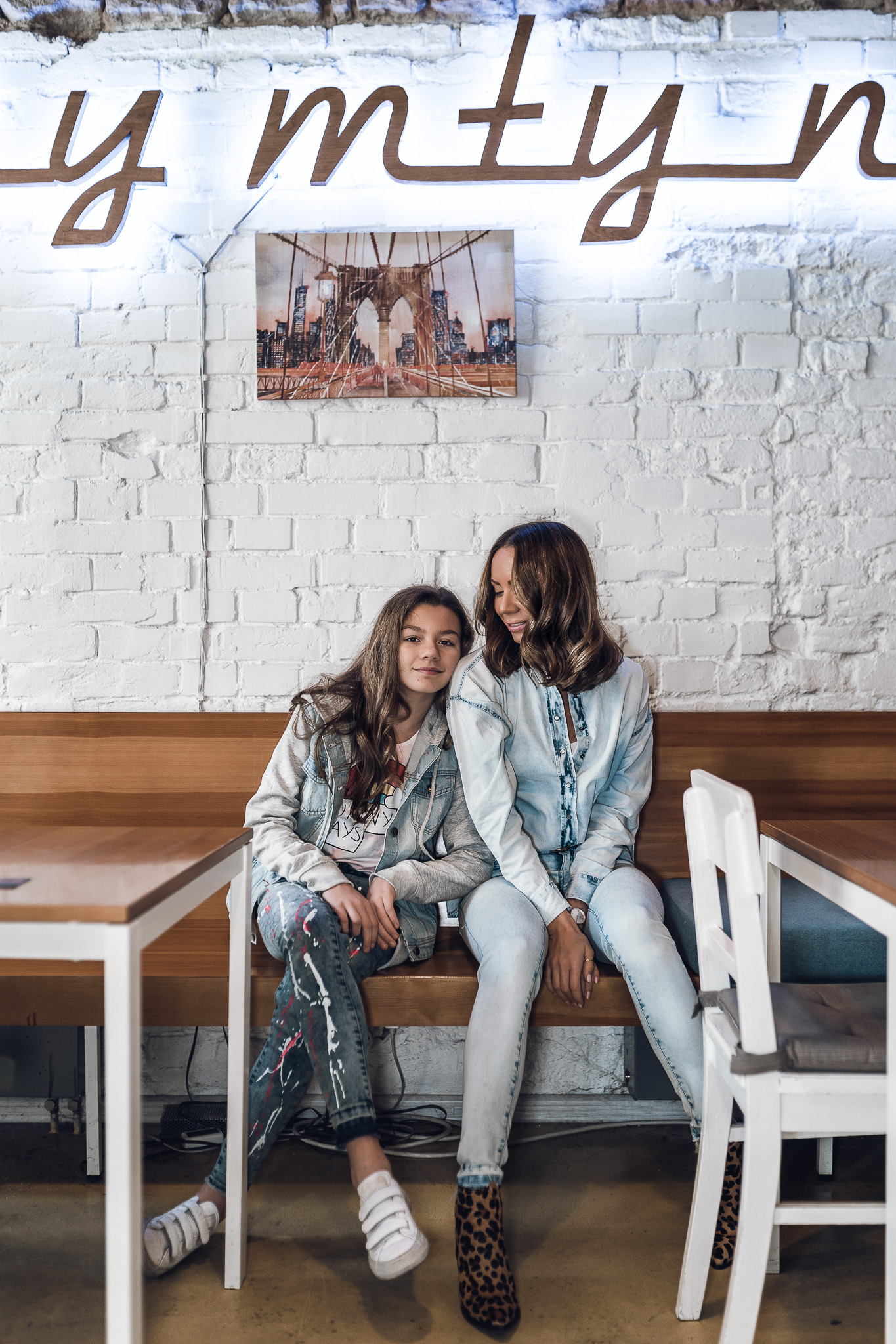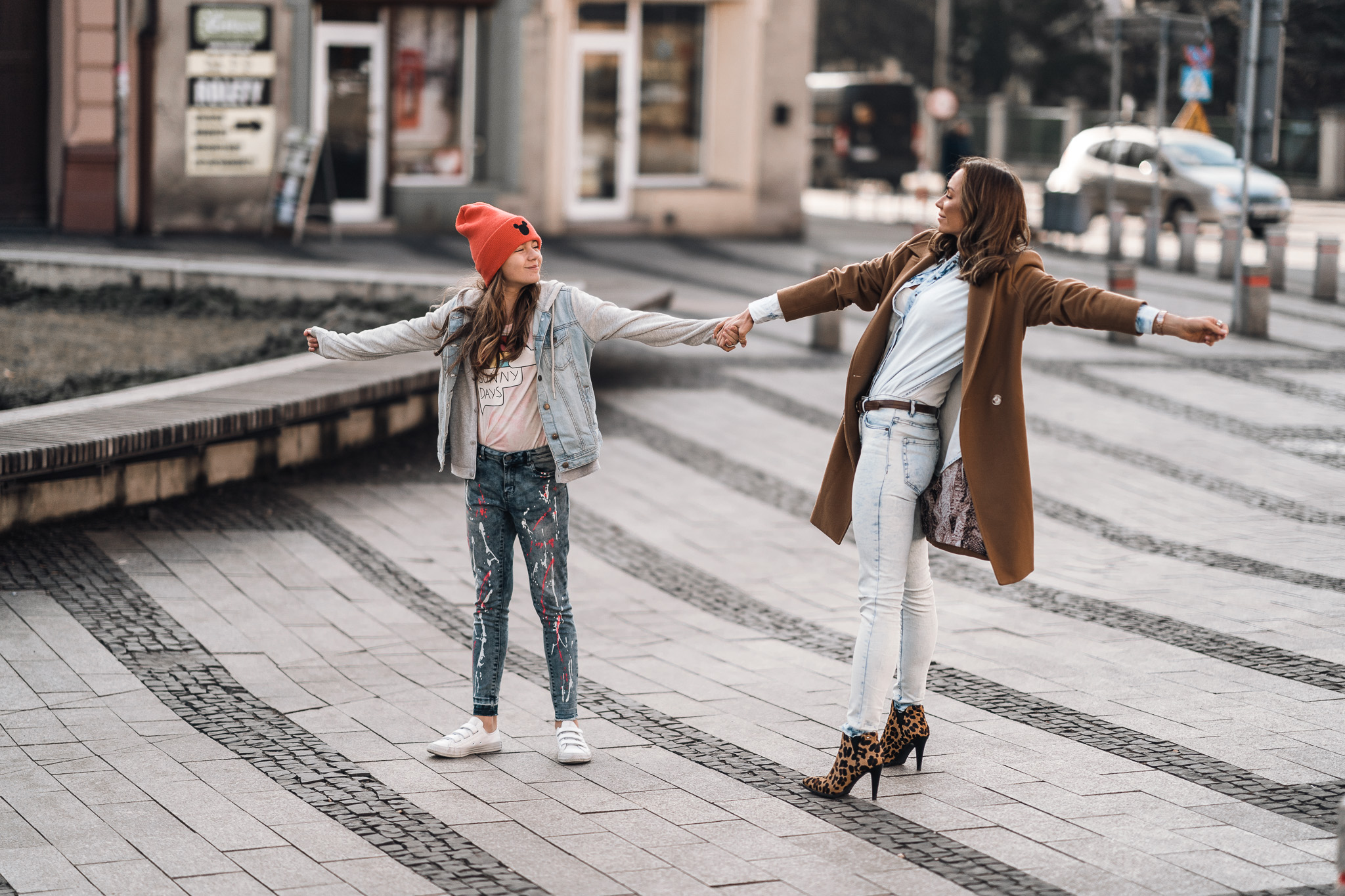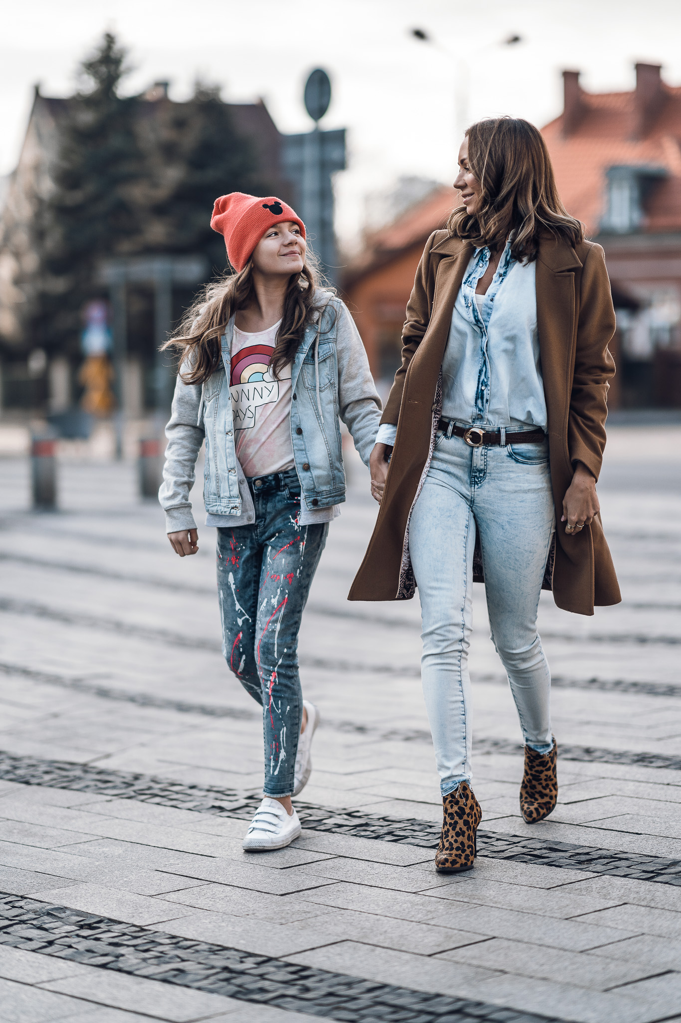 Olivce w nowej kolekcji „Let’s Denim” najbardziej spodobały się wystrzałowe dżinsy, skrapiane farbą. Dzięki wygodnej gumce w pasie i regulacji szerokości można idealnie dopasować rozmiar do dziecka. Poza tym spodnie są wyjątkowo miękkie, a dzięki temu bardzo wygodne. Do dżinsów dobrałyśmy pozytywną koszulkę w delikatnym odcieniu pudrowego różu. Całość wygląda wiosennie i dziewczęco ♡