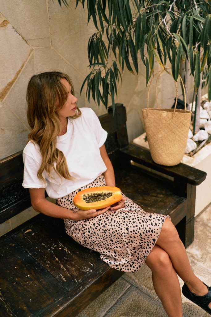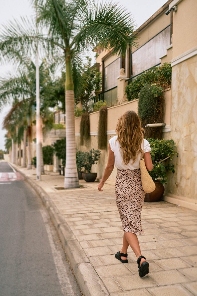 Dla mnie to najlepsze połączenie na co dzień, kobieca spódnica na dół, a na górę luźny t-shirt, może być nawet w stylu oversize. Z uwagi na to, że moja spódnica ma już wzory, polecam Wam dobrać gładką górę. Niech będzie minimalistycznie, subtelnie. Jeśli natomiast dzież będzie chłodniejszy stawiam tu na sweter, również bez wzorów i tak samo o kroju oversize. Tę samą spódnice fantastycznie będzie można wykorzystać jesienią.