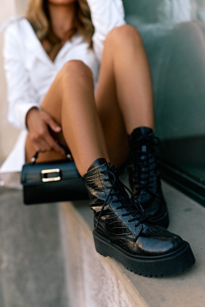 Czarne, sznurowane, za kostkę, są niekwestionowanym hitem od wielu sezonów. Z całą pewnością model ten został zainspirowany klasycznym martensami. Idealne na co dzień, do jeansów, dresów, ale również świetne do sukienki. Dzięki platformie dodają nam 2-3cm sprawiając, że sylwetka wygląda smuklej. Mój ulubiony model, uwielbiam i noszę niemal każdego dnia.