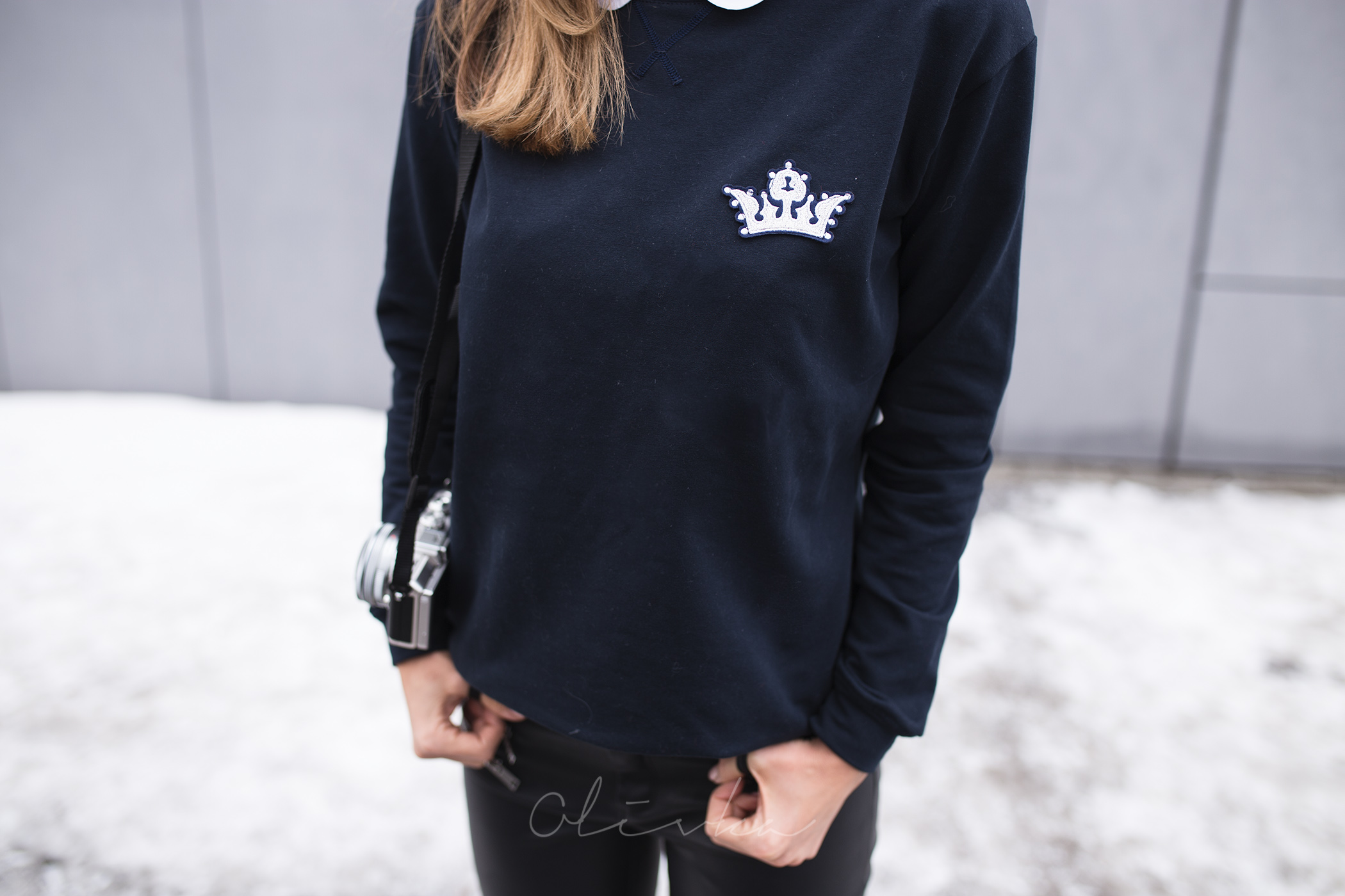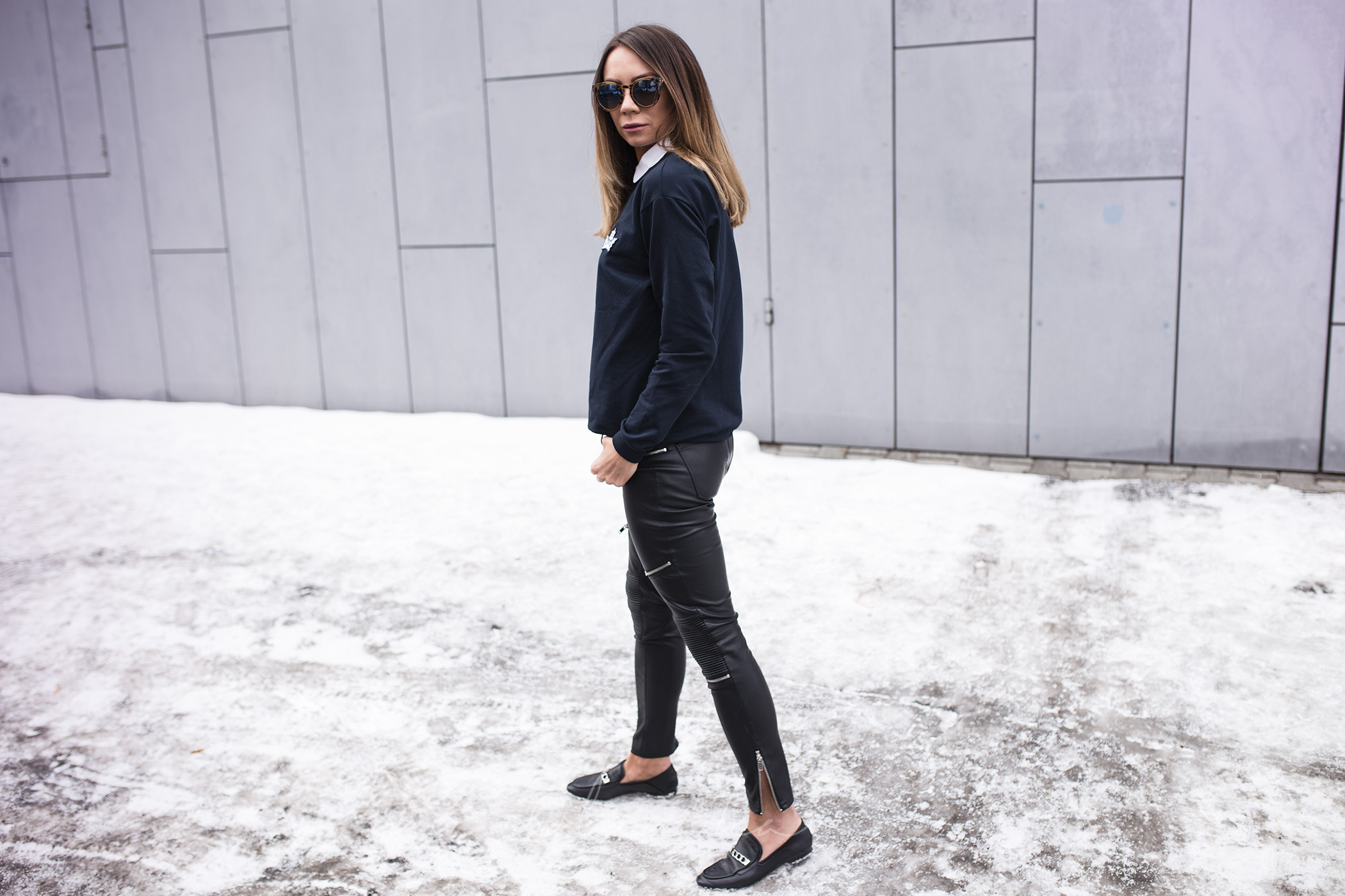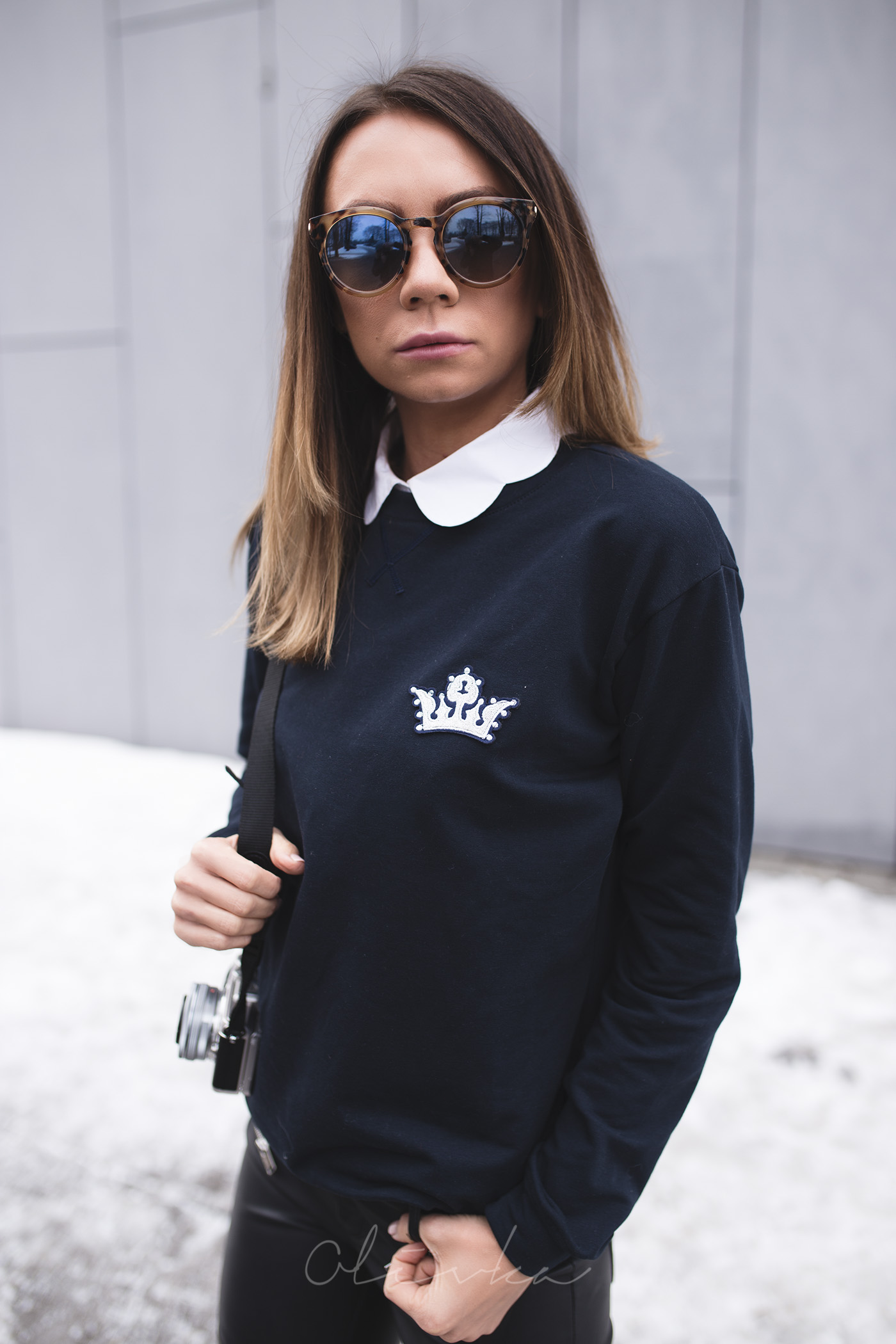 Na wstępie wytłumaczę pod spodniami mam rajstopy więc kostki nie były gołe 😛 Dziś klasyczny zestaw na każdy dzień, moje ulubione zimowe kolory w jednym połączeniu. Mimo, że czerń, biel i granat są tu na pierwszym planie to same widzicie, że zestaw nie jest nudny. Mam nadzieję, że przypadł Wam do gustu! 🙂