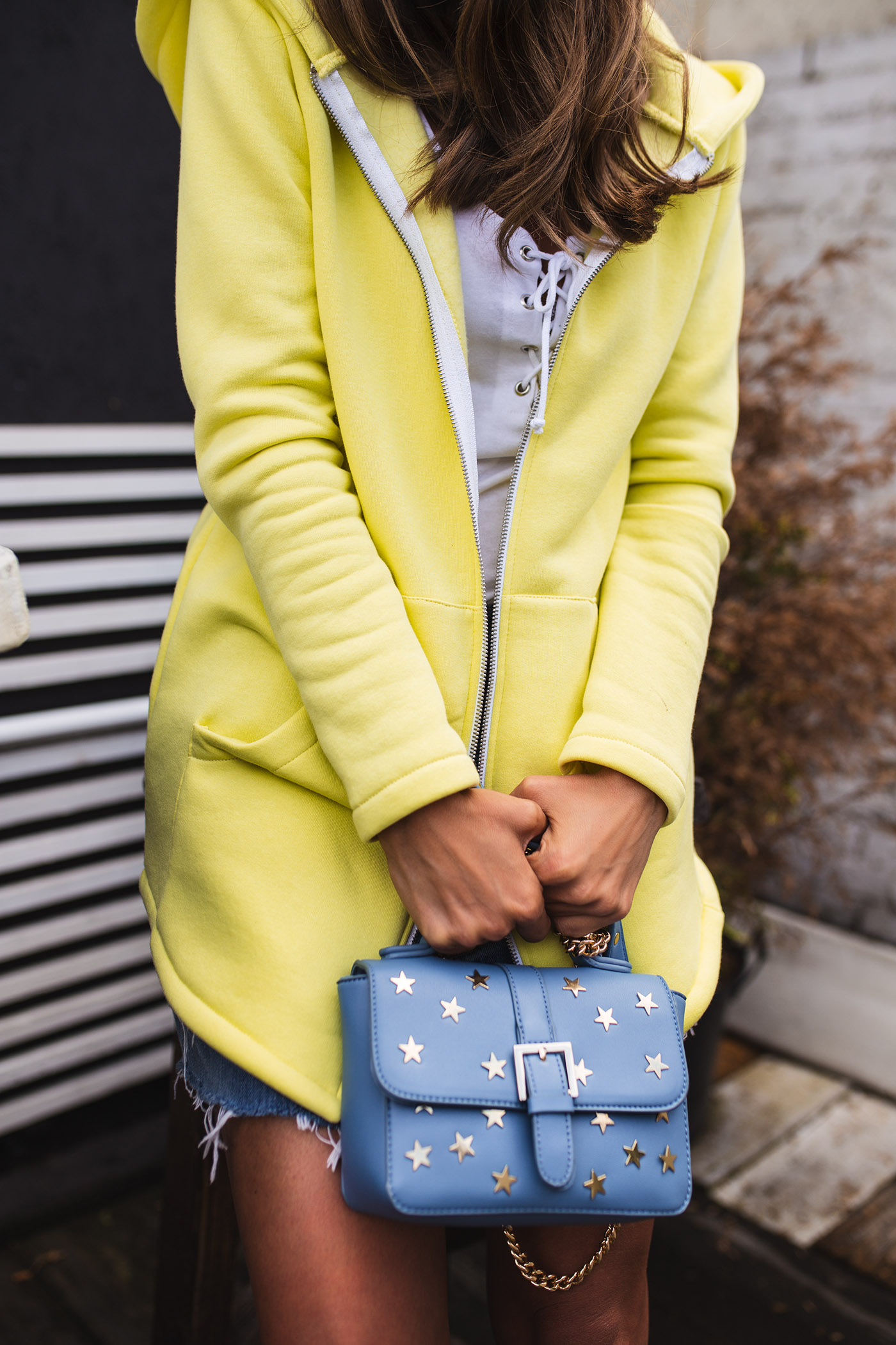 Dzisiejszy zestaw to połączenie letniego luzu, wygody i nutka kobiecości. Wydawałoby się, że bluza z kapturem jest typowo sportowym ubraniem, ale zobaczcie same jak świetnie prezentuje się w takim wydaniu. Uwielbiam ją nosić na co dzień, zabierać na wakacje, rower, rolki czy spacery, sprawdza się idealnie. Z uwagi na to, że fasonem przypomina płaszczyk możemy zakładać ją do krótkich szortów czy spódniczek, ale równie dobrze wygląda z klasycznymi dżinsami.