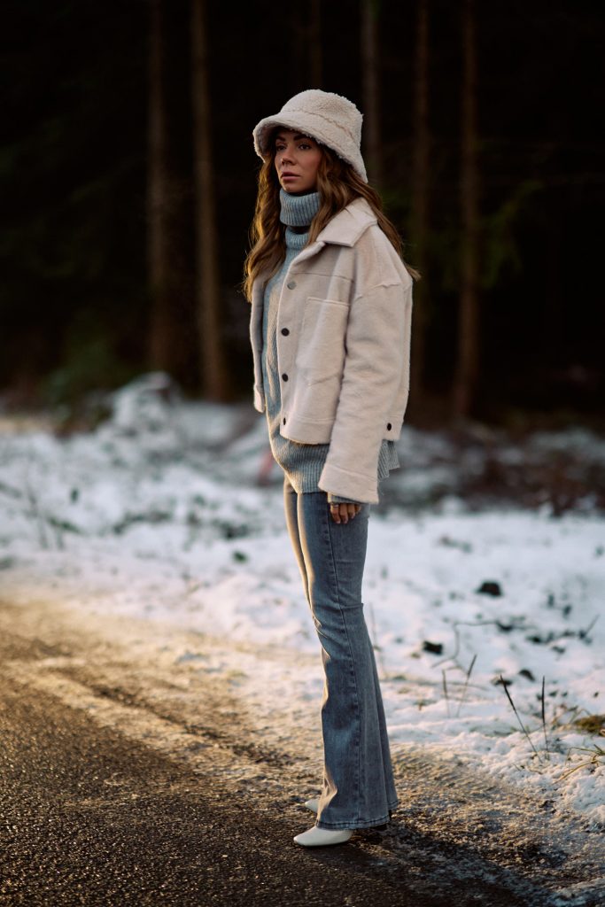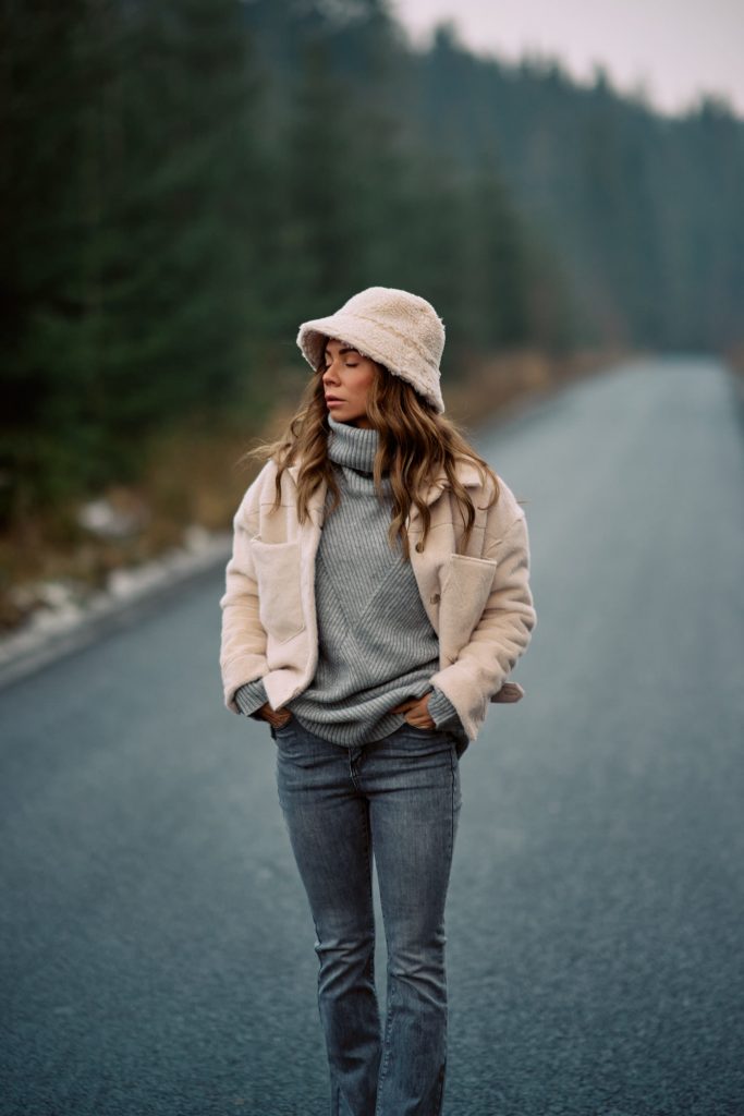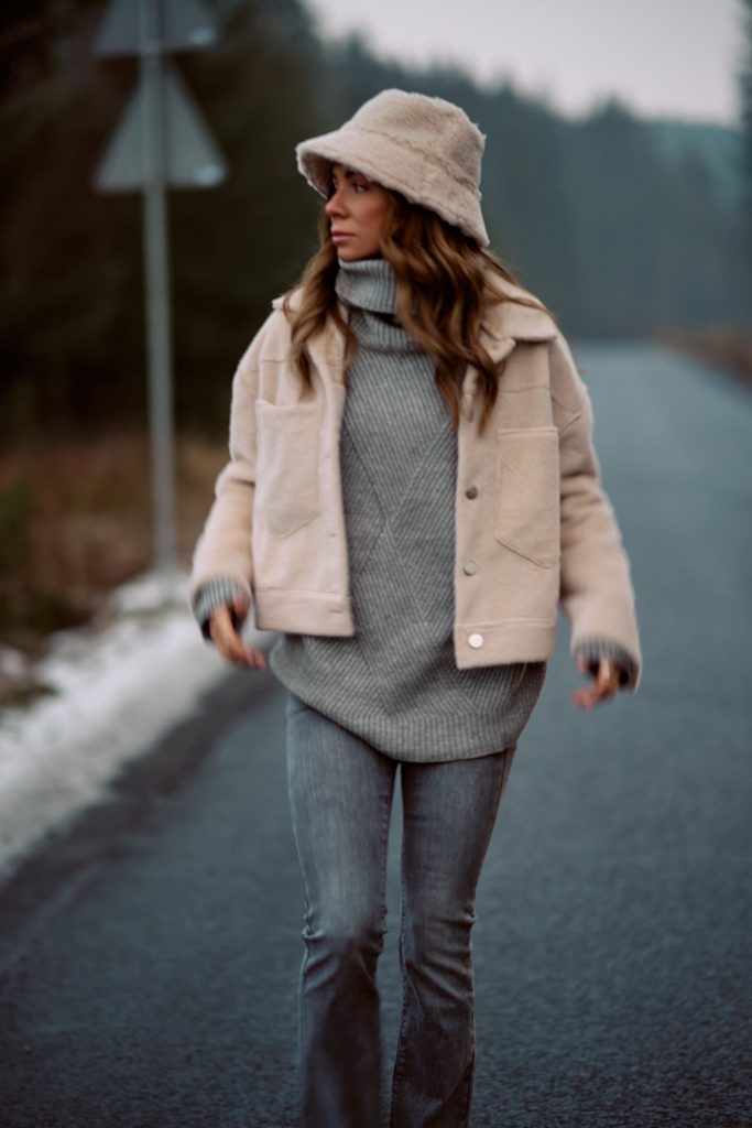 W dzisiejszej stylizacji bardzo podoba mi się połączenie kolorów. Szarości i beże wyglądają naprawdę dobrze w swoim towarzystwie. Kurtkę już znacie, jej kolor i fason sprawiają, że pasuje do wielu rzeczy i jest idealna na co dzień. Golf oversize to must have nie tylko na zimę, ale również na wiosnę.