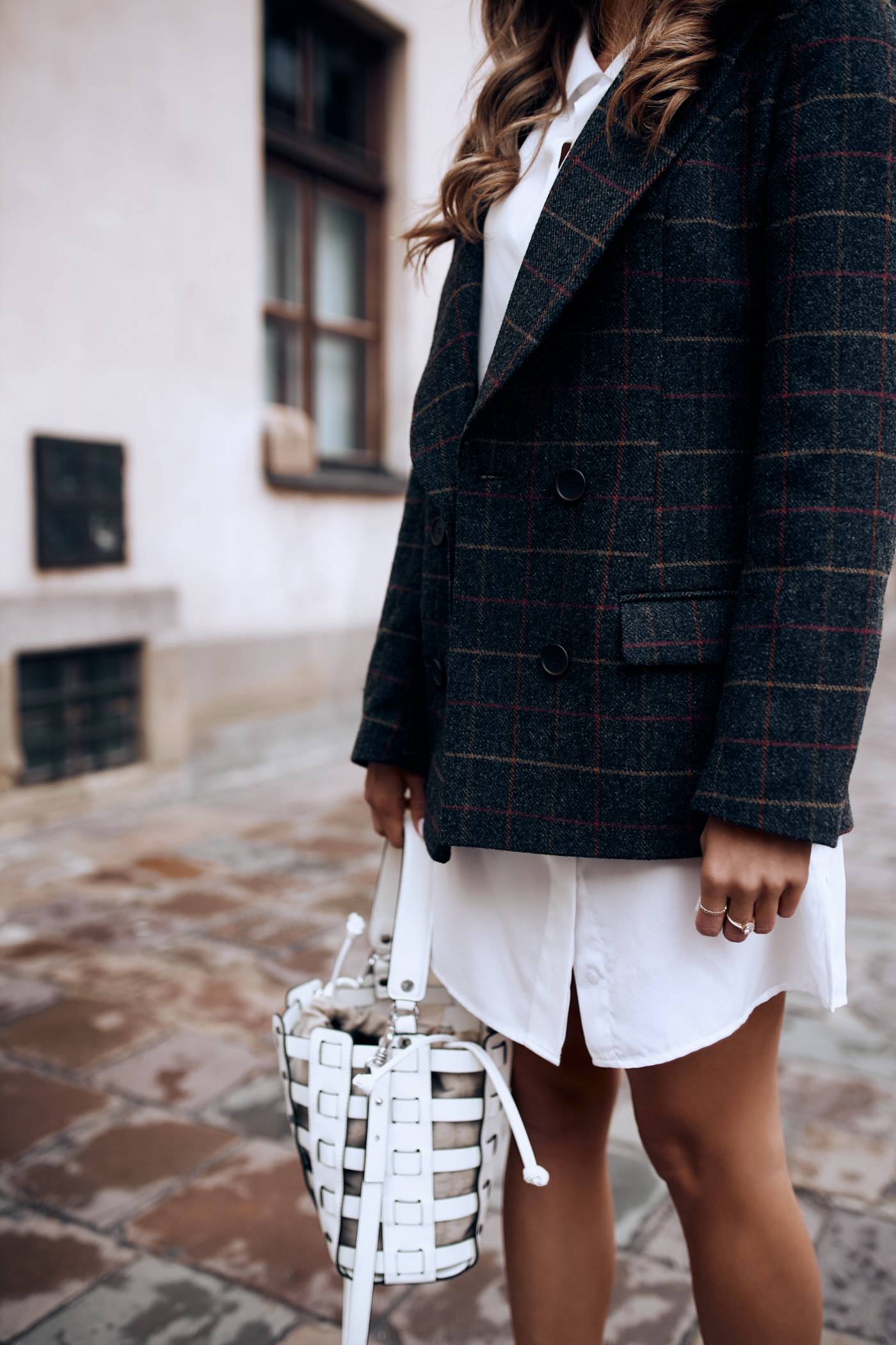 Wiem, że bardzo lubicie takie klasyczne, minimalistyczne stylizacje, dlatego dziś kolejna propozycja. Marynarka w kratę i biała, koszulowa sukienka. Obie rzeczy świetnie do siebie pasują i uzupełniają się wzajemnie, a drugiej strony, każdą z tych rzeczy możecie wykorzystać do wielu innych zestawów.