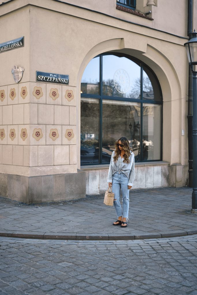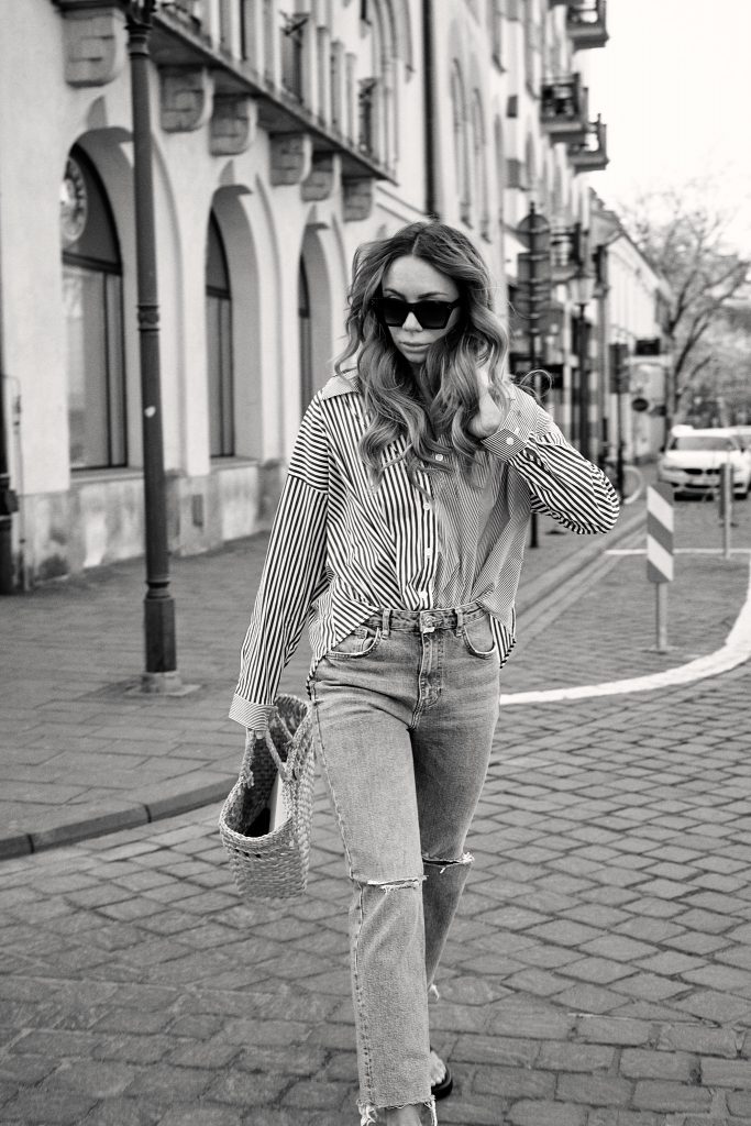 Zastanawiasz się czy koszule w paski będą modne w tym sezonie, odpowiedź jest zawsze taka sama. One z mody nie wychodzą nigdy. Mój ulubiony sposób na koszule w tym sezonie, to spodnie z wysokim stanem oraz klapki bądź sandały. Taki miks jest hitem tego sezonu i chociaż nie podążam ślepo za trendami, to ten podoba mi się ogromnie!
