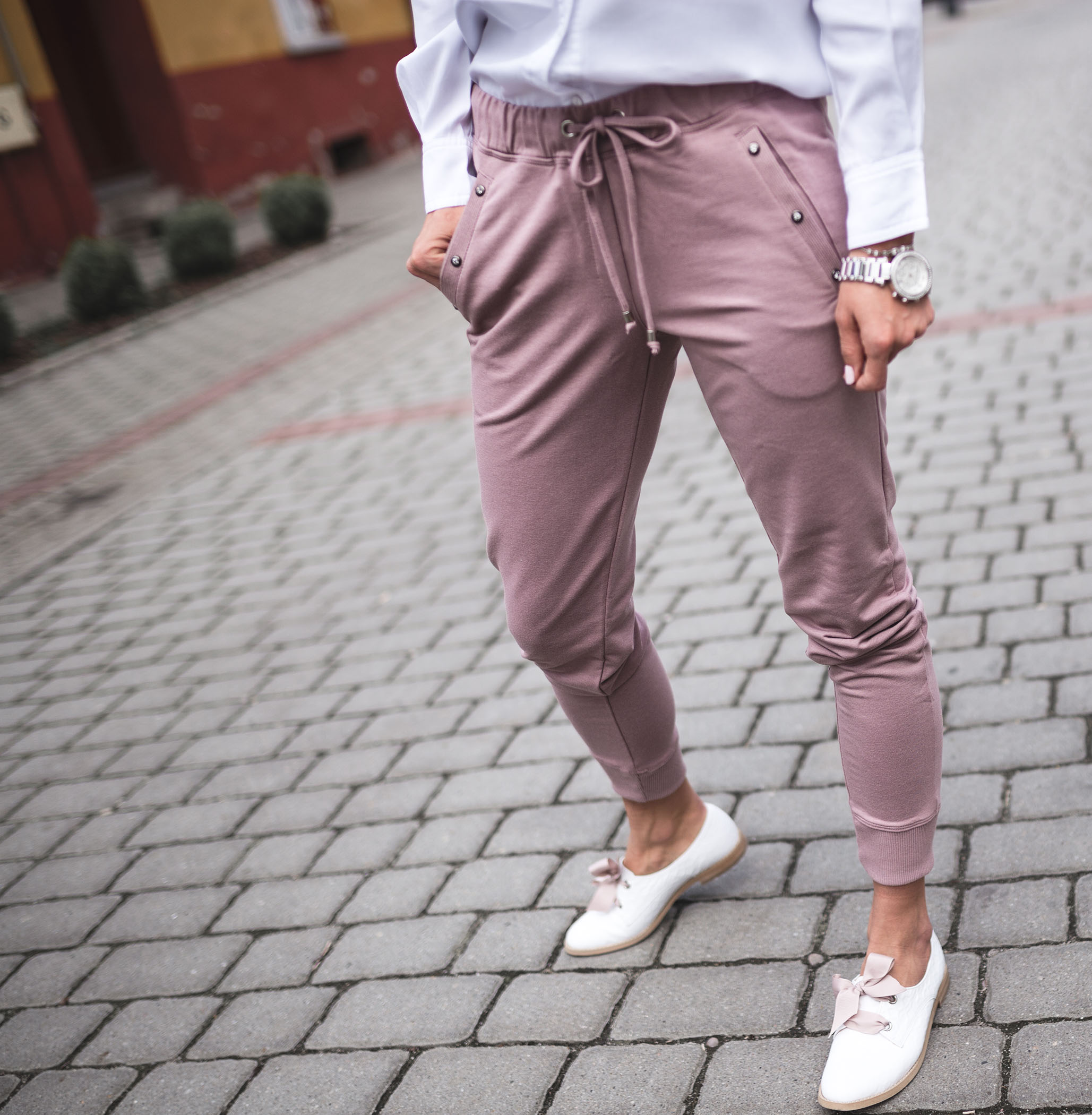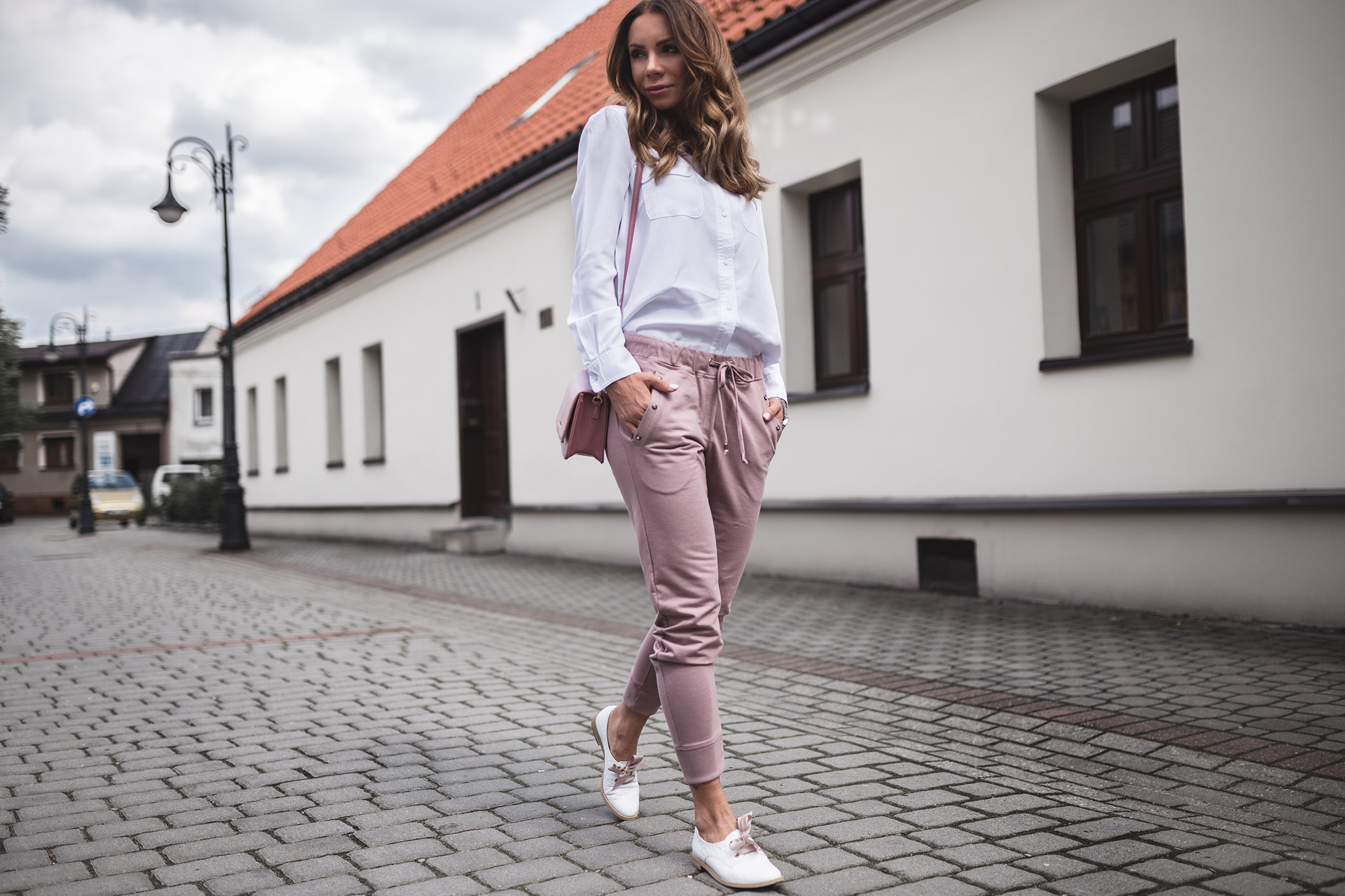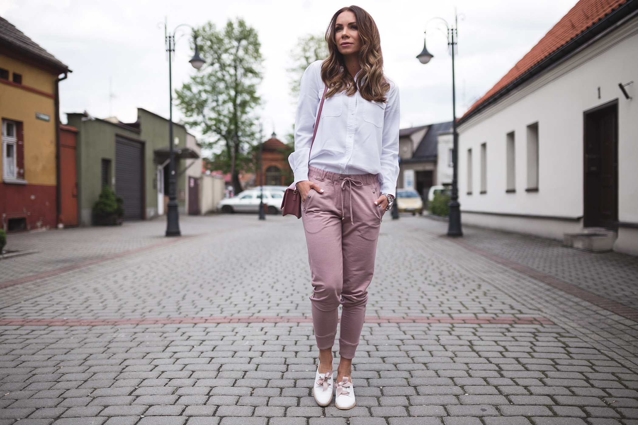 Idealny zestaw na wiosenne dni, chłodniejsze letnie wieczory, a także jesień. Z pewnością można wykorzystać go na różne sposoby. Jeśli myślałyście, że takie spodnie mogą stanowić tylko sportową część garderoby, to możecie teraz zobaczyć jak fajnie komponują się w bardziej eleganckim wydaniu.