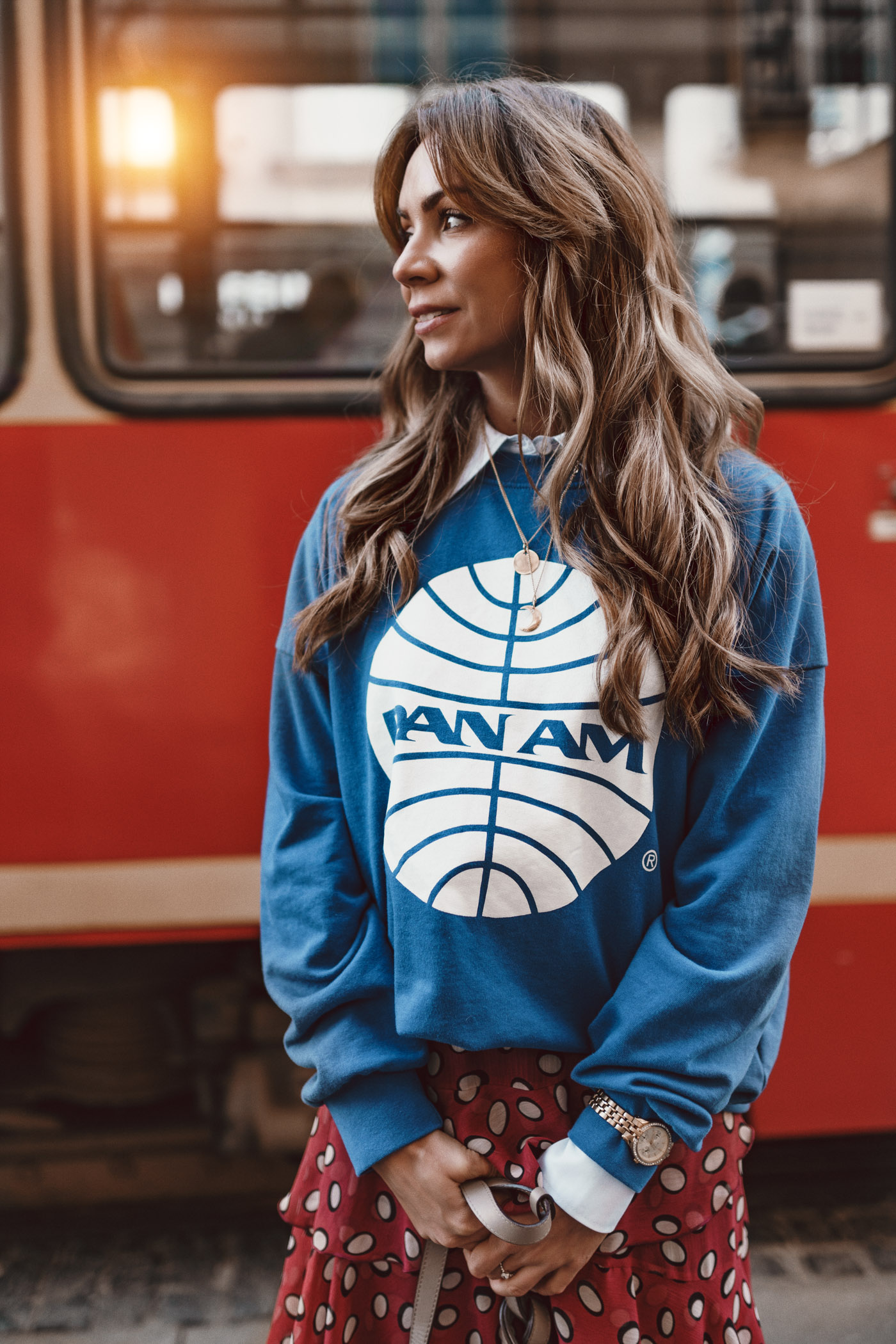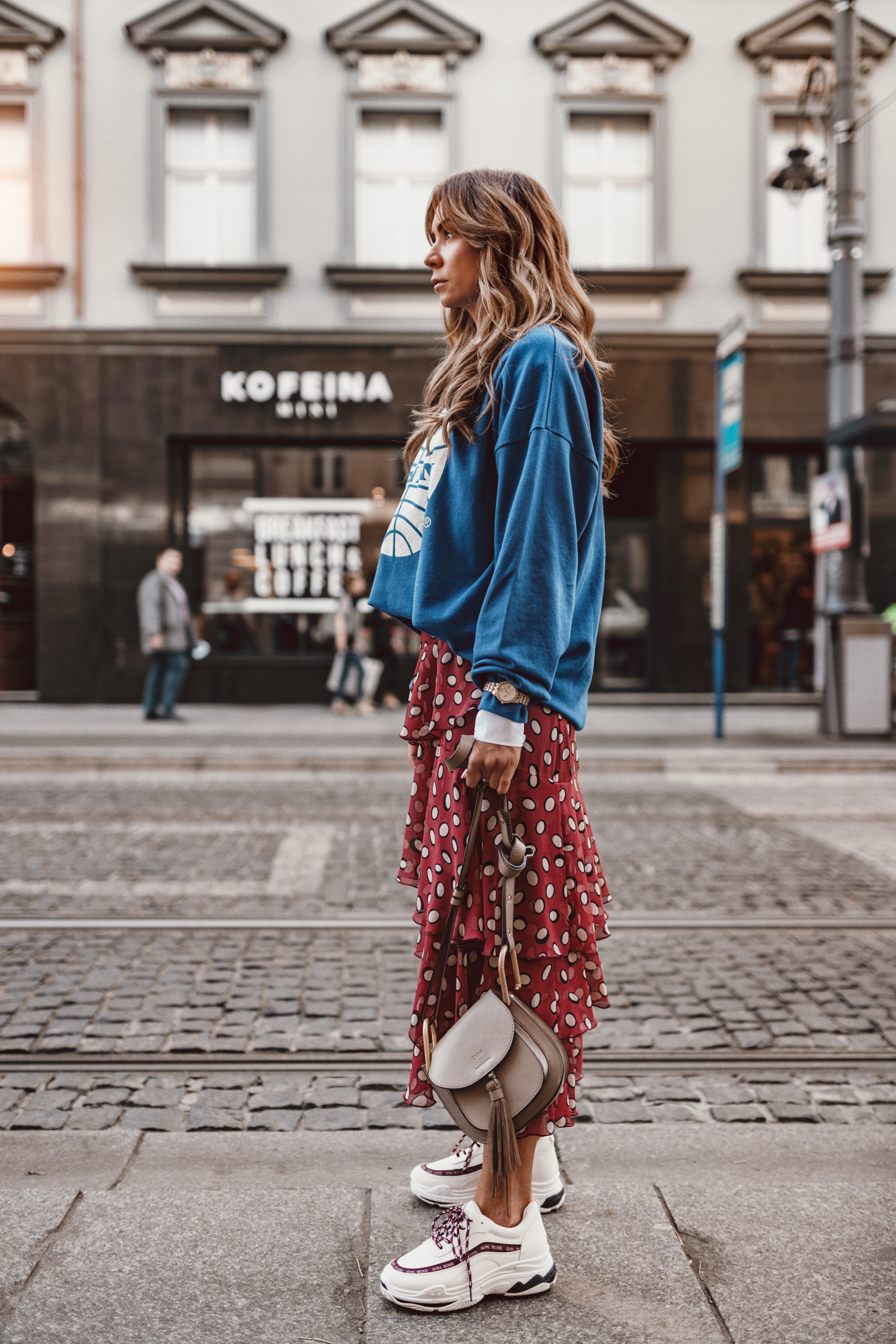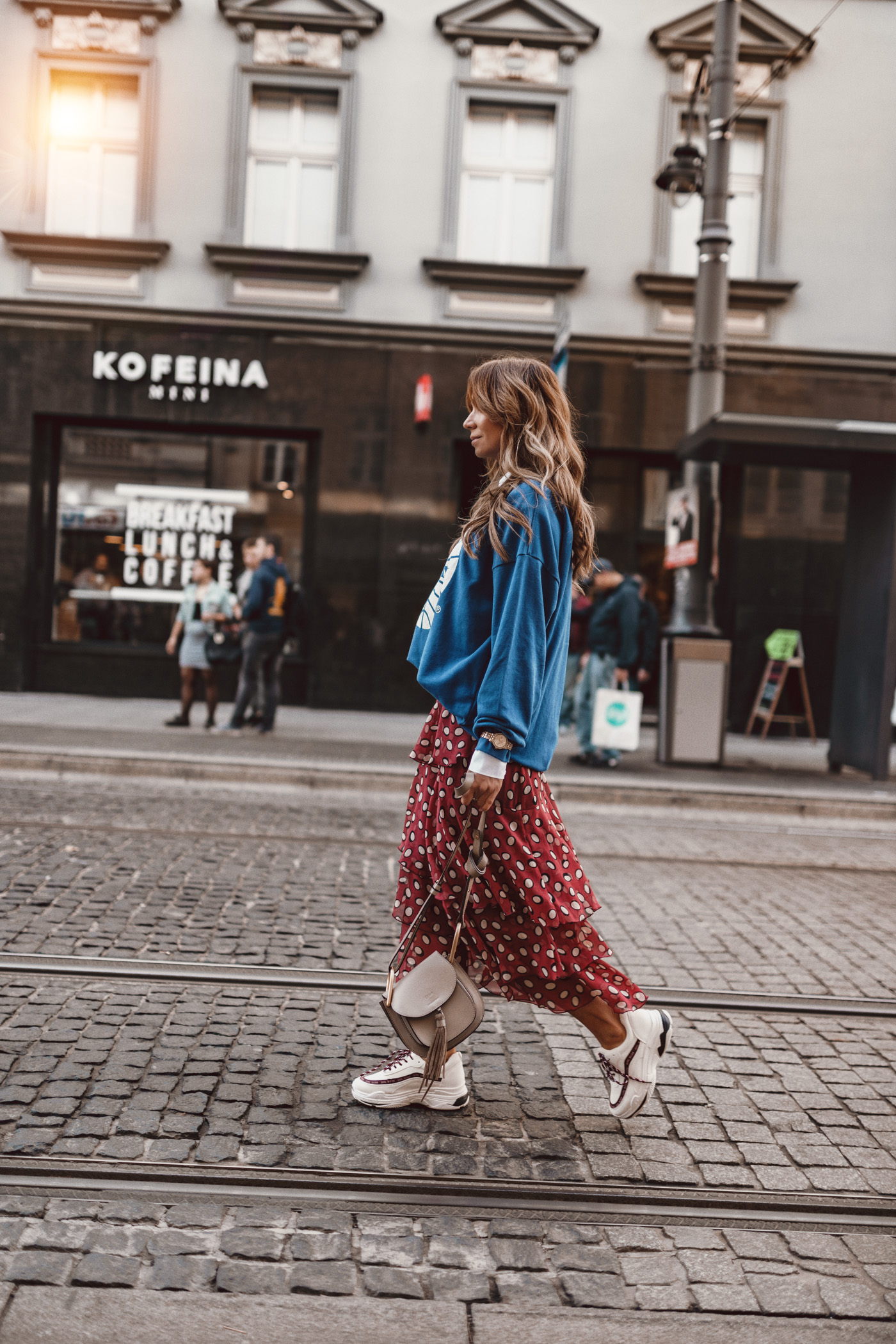 Bardzo fajne połączenie, takie dość nieoczywiste, ale zarówno buty, jak i bluza komponują się świetnie z tą spódnicą. Mega mi się podoba!