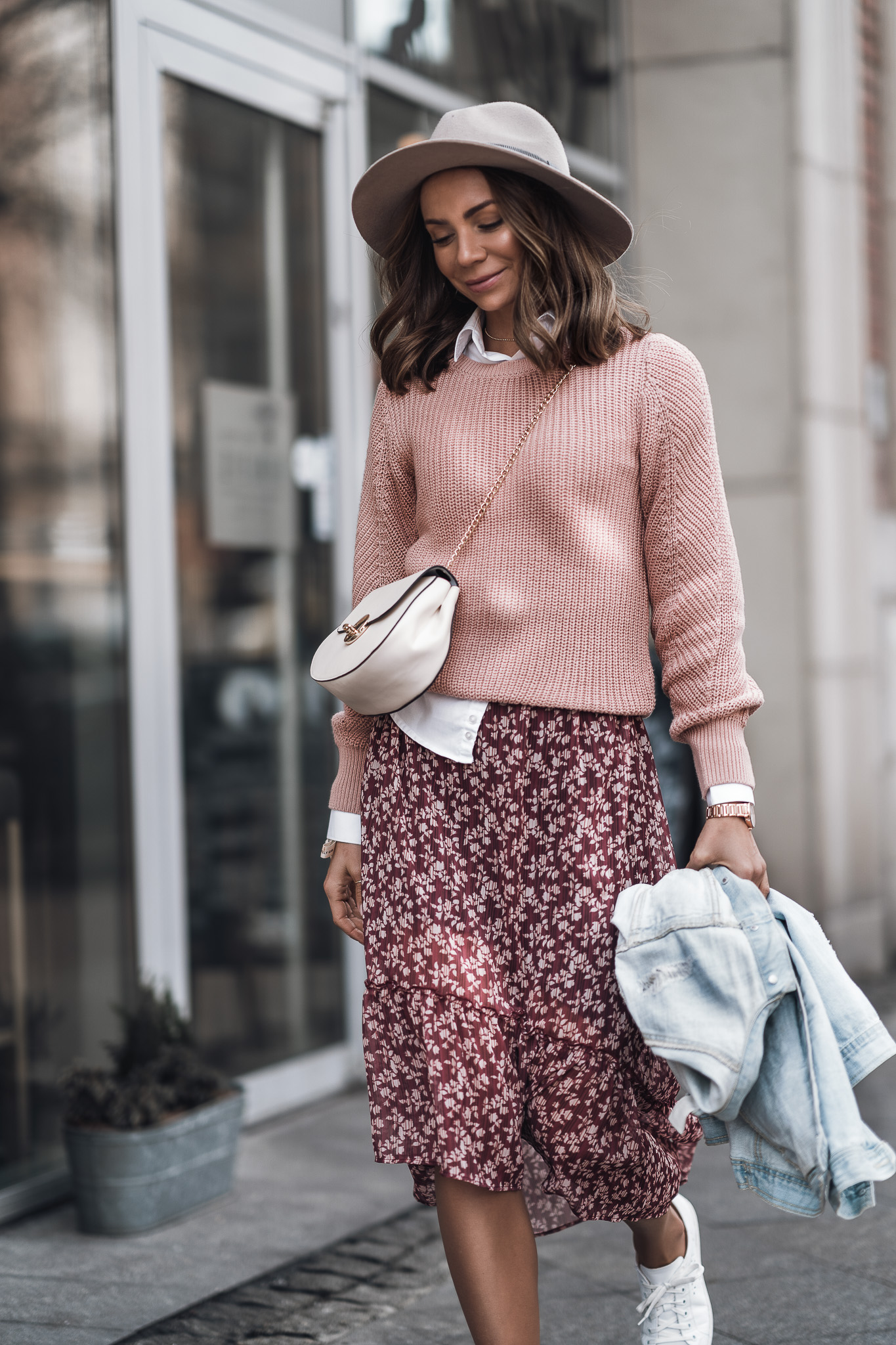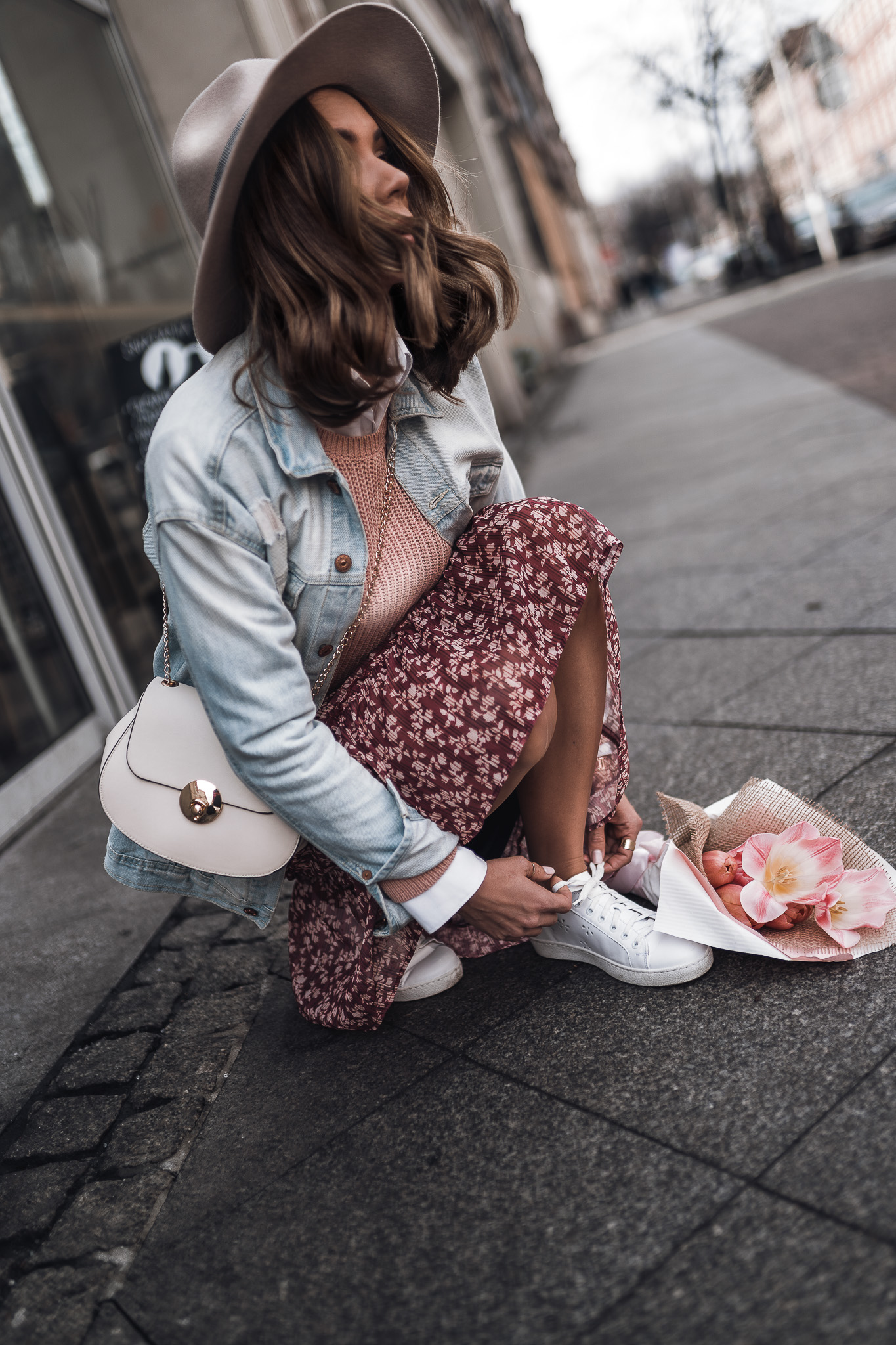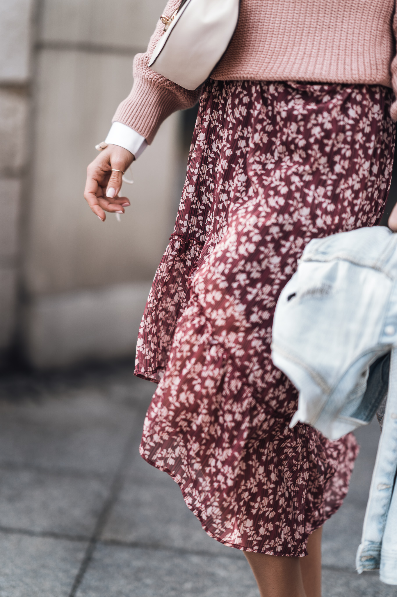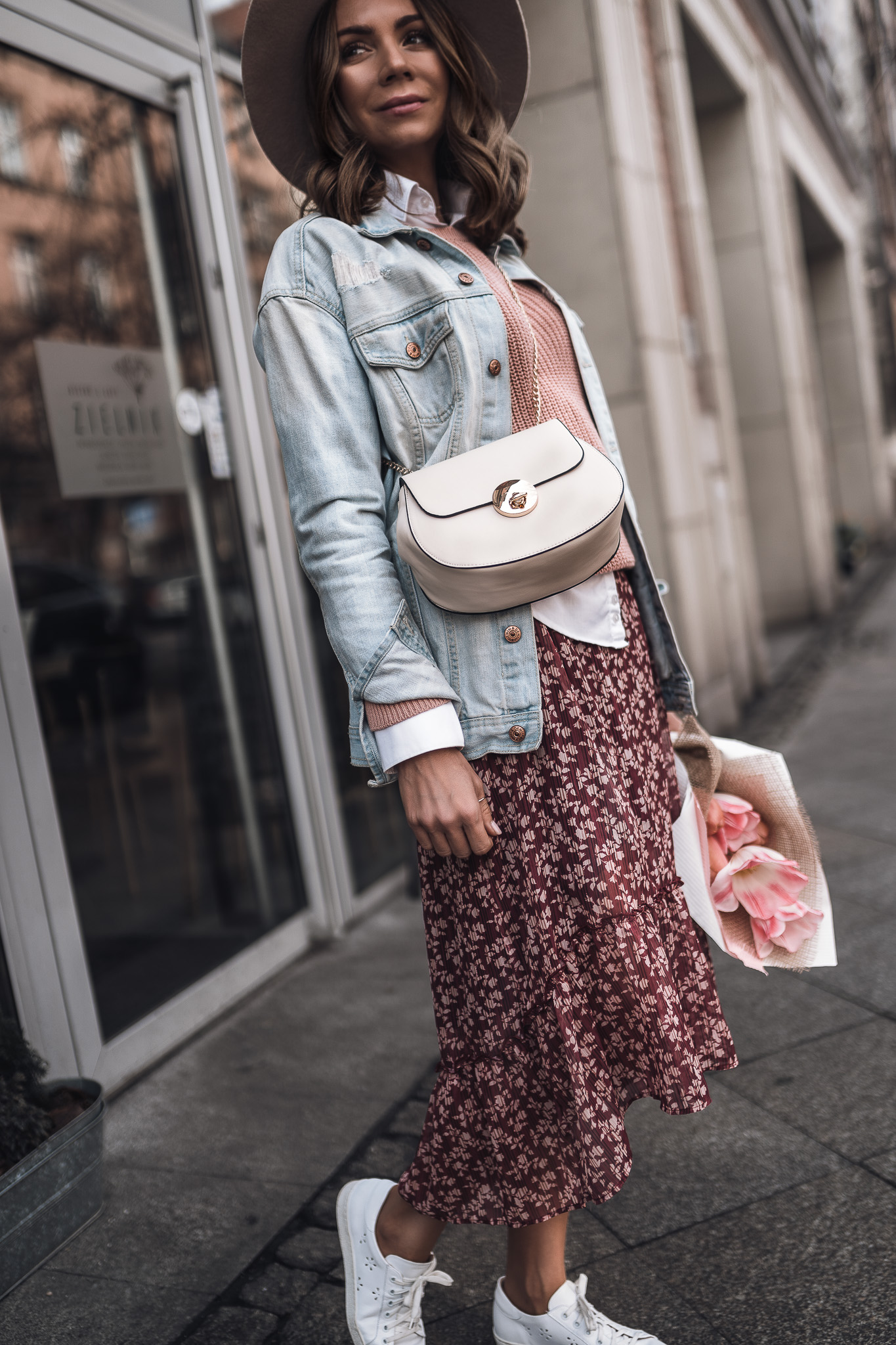 Uwielbiam taką długość, pięknie wygląda z obcisłym, prostym topem, białą koszulą czy swetrem, tworząc romantyczny, dziewczęcy look. Pasują do niej zarówno proste trampki jak i botki na słupku. Tym razem stawiam na wzór kwiatowy i gładką górę, myślę, że zestaw wygląda wyjątkowo i jest moim ulubieńcem na najbliższe, ciepłe dni.