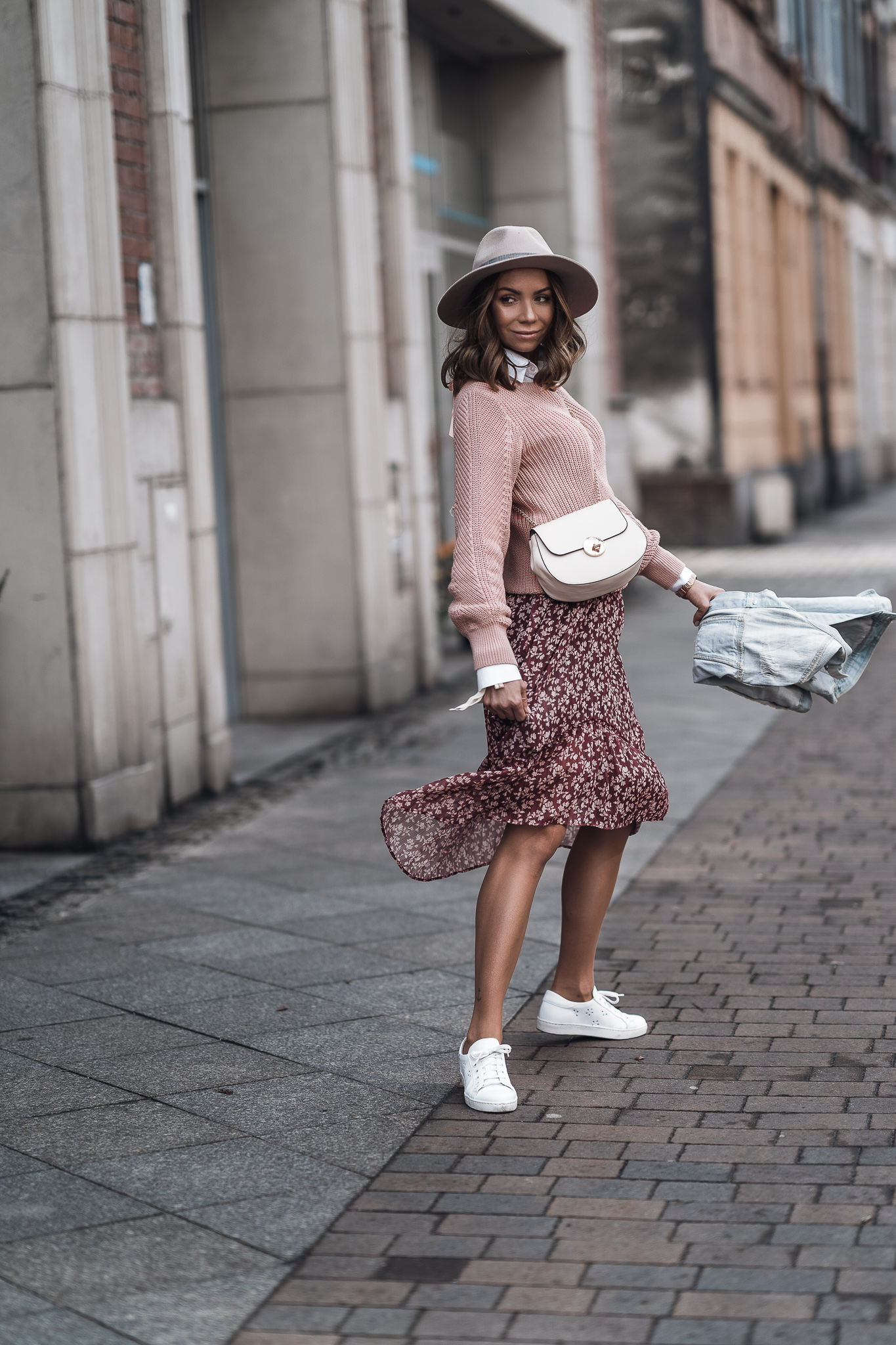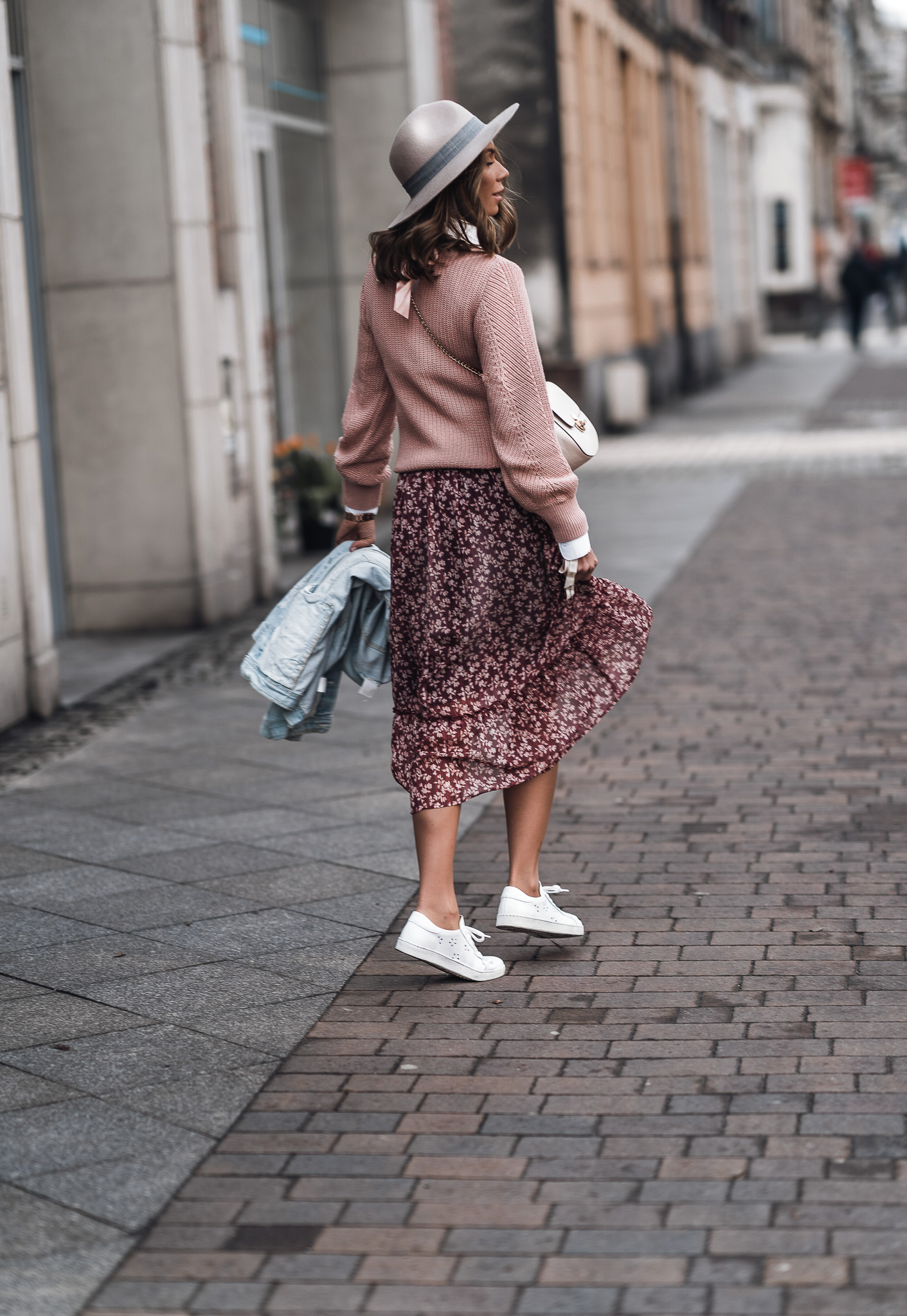 Genialna stylizacja. Połączenie lekkiej spódnicy ze swetrem wygląda świetnie. Dodatki nadają ciekawego charkteru.