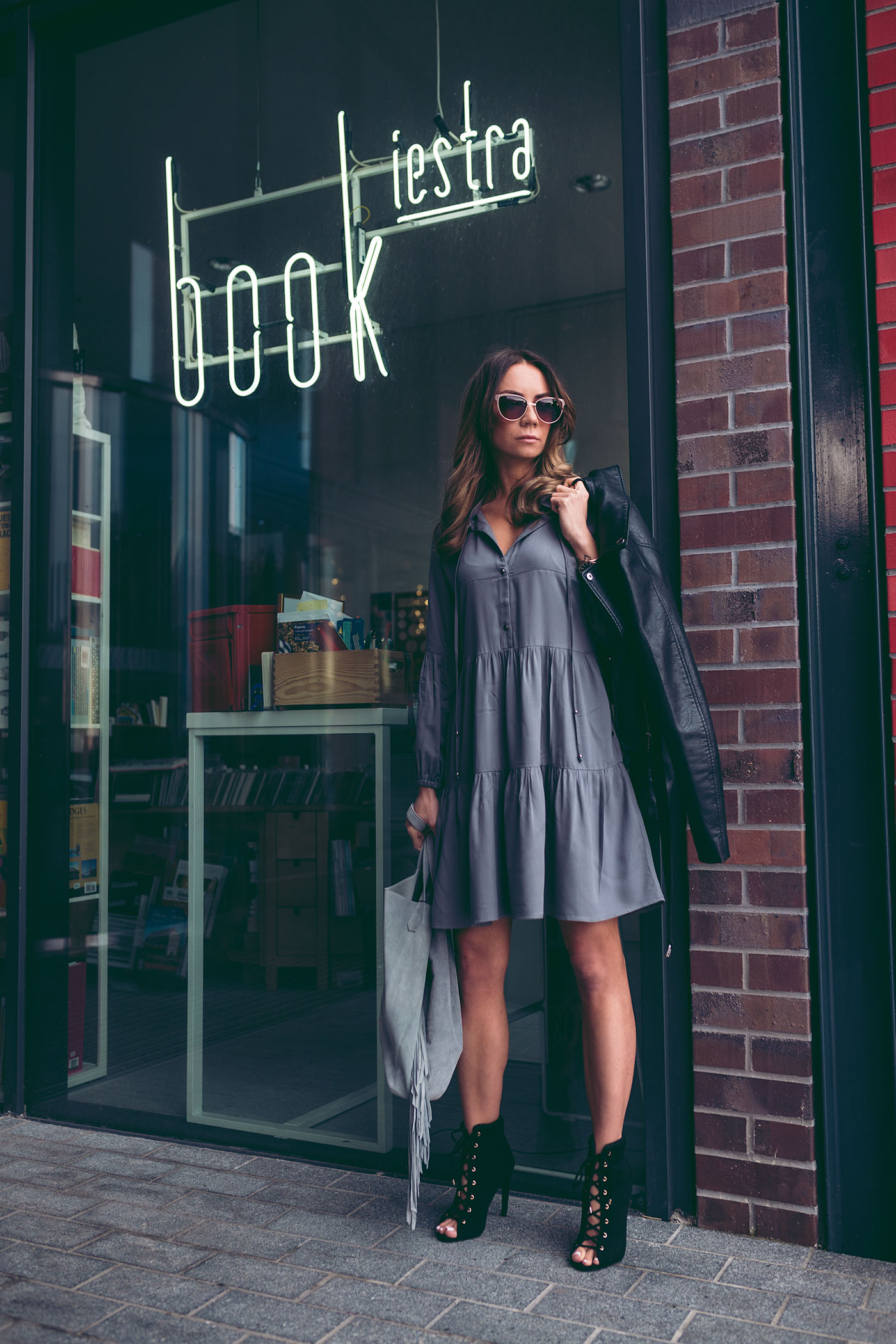 Zestaw numer dwa, szara, oversizowa sukienka w połączeniu ze skórzaną ramoneską tworzy kultowe zestawienie, które chyba nigdy nie przestanie być modne, sprawdzi się idealnie na co dzień, ale również na wieczorne wyjście z przyjaciółmi.