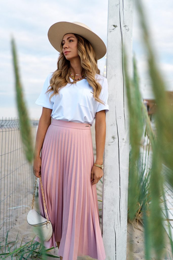 Długość midi, to mój kolejny must-have sezonu. Dotyczy to zarówno spódnic jak i sukienek. Naprawdę bardzo się z nią polubiłam. Kobieca, wygodna i niezwykle uniwersalna. W wersji eleganckiej, świetnie sprawdzą się sandałki lub klapki na średnim obcasie. Na co dzień delikatne trampki w białym kolorze.