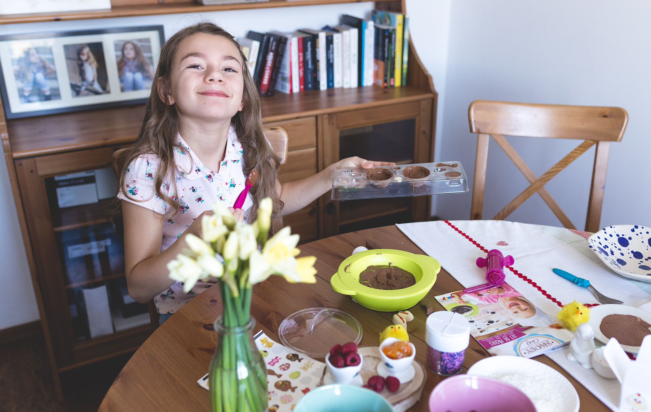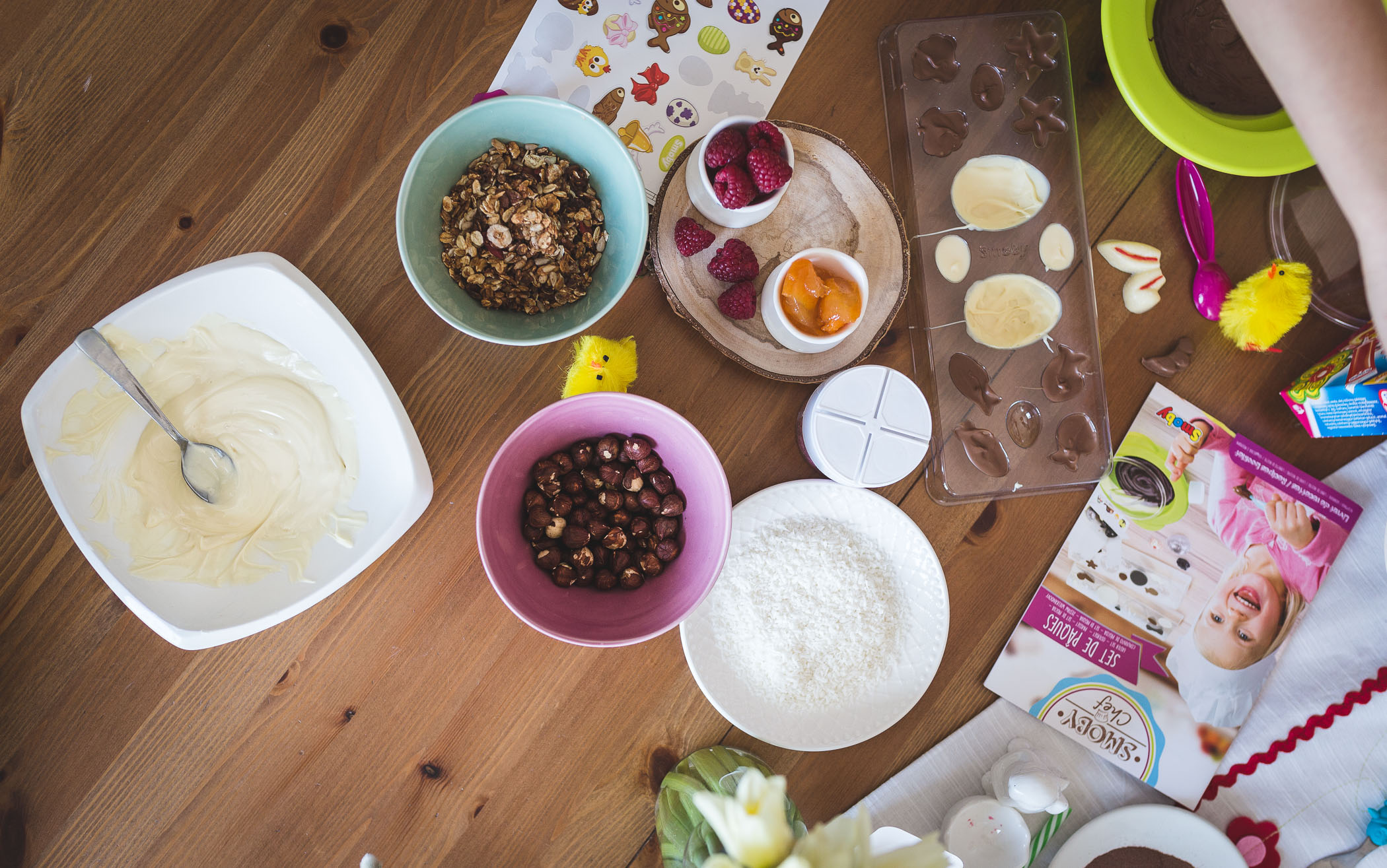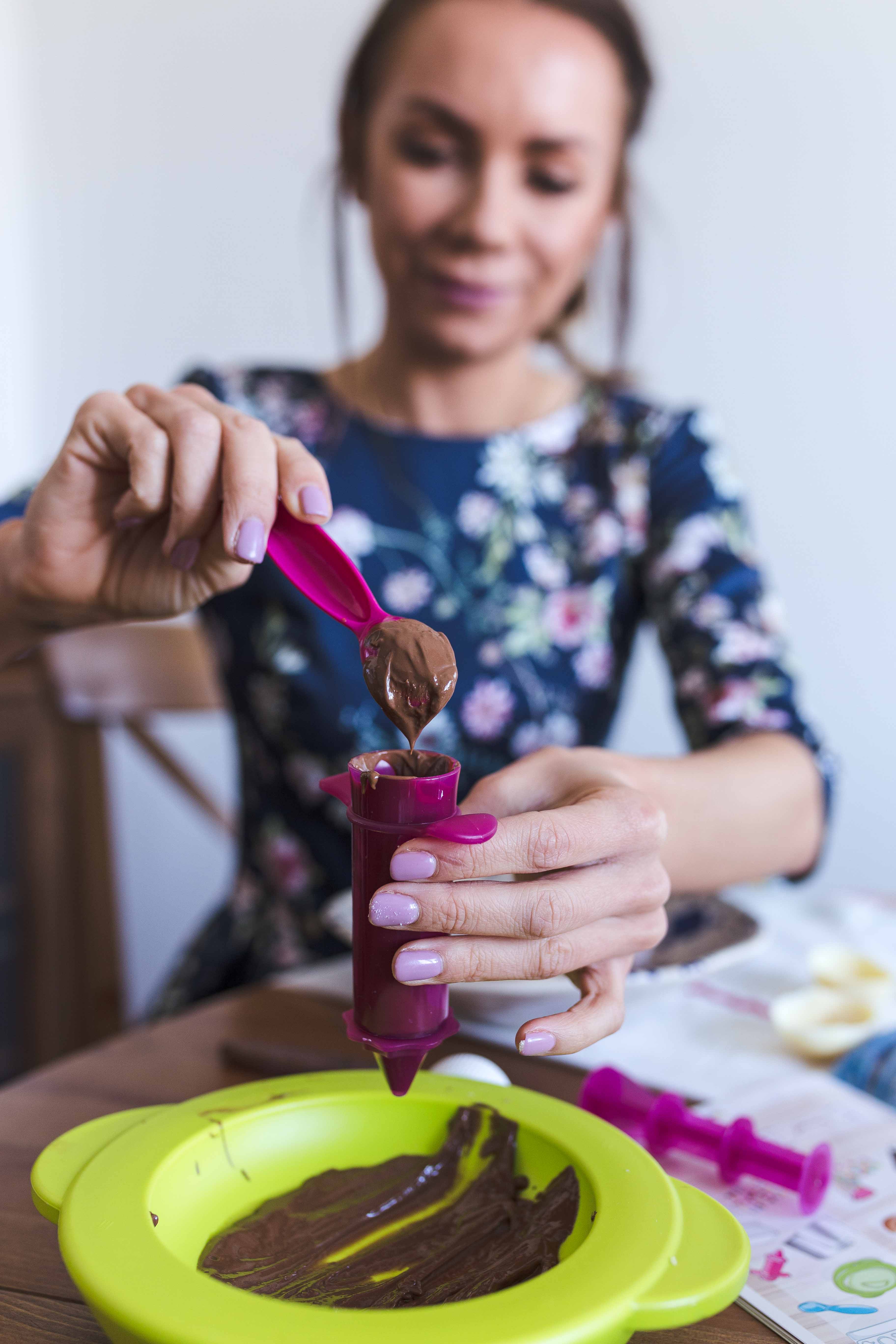 W zestawie Smoby Chef znajdziecie wszystko, by przygotować takie jajeczka, wystarczy dokupić ulubioną czekoladę oraz dodatki w postaci orzechów, kokosowych wiórek, migdałów, malin czy dżemu. Co możemy wyczarować? Klasyczne czekoladowe jajka ozdobione kokardką czy długimi uszami, kurkę, króliczka. Niech wyobraźnia Was nie ogranicza. Jeśli chodzi o dekorowanie niech nie zniechęci Was brak zdolności manualnych i plastycznych. Za pomocą kilku trików szybko nauczycie się tej sztuki. A nawet jeśli coś nie wyjdzie nie tak, w dekorowaniu liczy się fantazja i dobra zabawa! Tak, samo jeśli chodzi o formy, chociaż przyznam, że akurat bardzo łatwa część w tworzeniu Wielkanocnych przysmaków, jeśli pójdzie coś nie tak nic się nie zmarnuje, możecie przecież ponownie wrzucić ją do miseczki, roztopić i spróbować ponownie.