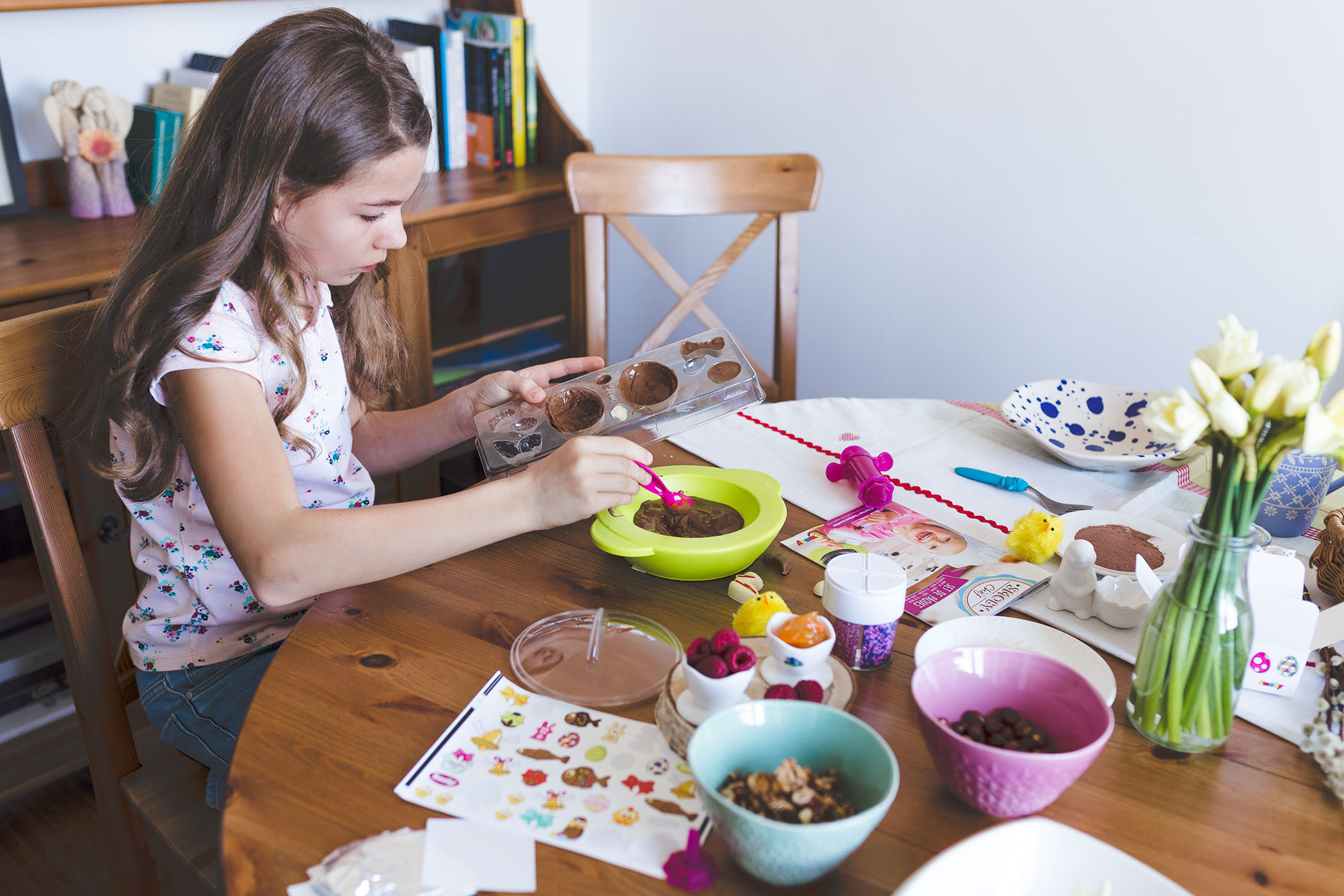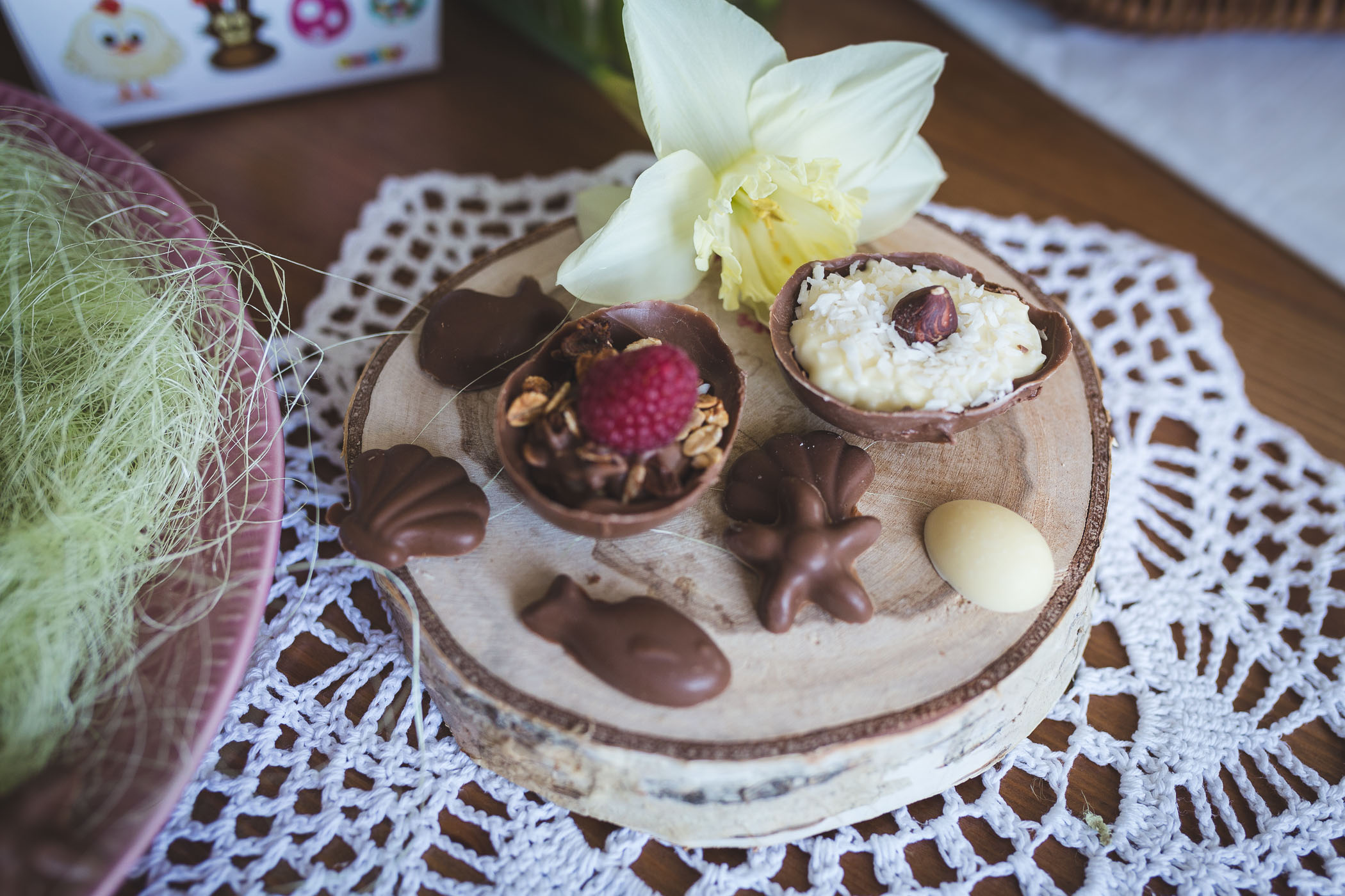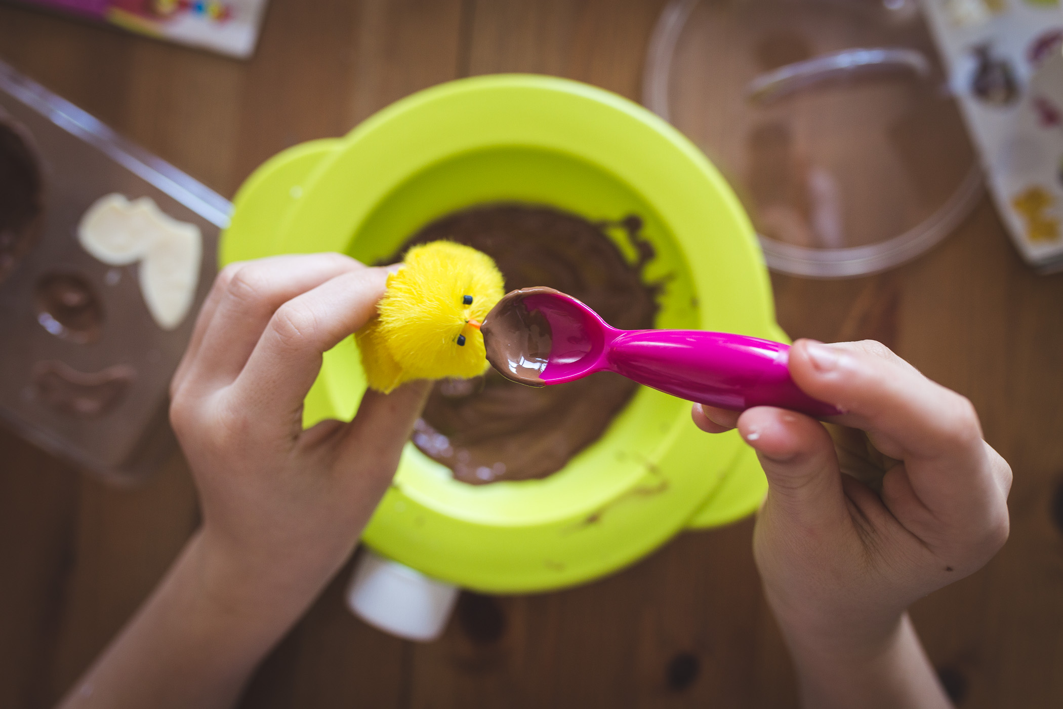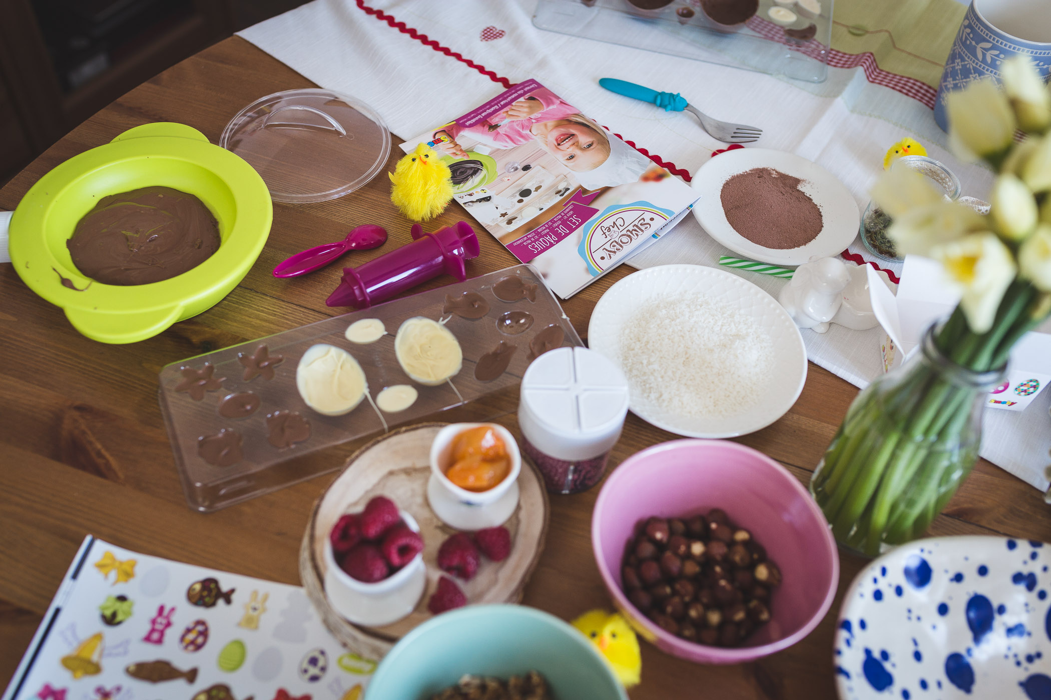W zestawie Smoby Chef znajdziecie wszystko, by przygotować takie jajeczka, wystarczy dokupić ulubioną czekoladę oraz dodatki w postaci orzechów, kokosowych wiórek, migdałów, malin czy dżemu. Co możemy wyczarować? Klasyczne czekoladowe jajka ozdobione kokardką czy długimi uszami, kurkę, króliczka. Niech wyobraźnia Was nie ogranicza. Jeśli chodzi o dekorowanie niech nie zniechęci Was brak zdolności manualnych i plastycznych. Za pomocą kilku trików szybko nauczycie się tej sztuki. A nawet jeśli coś nie wyjdzie nie tak, w dekorowaniu liczy się fantazja i dobra zabawa! Tak, samo jeśli chodzi o formy, chociaż przyznam, że akurat bardzo łatwa część w tworzeniu Wielkanocnych przysmaków, jeśli pójdzie coś nie tak nic się nie zmarnuje, możecie przecież ponownie wrzucić ją do miseczki, roztopić i spróbować ponownie.
