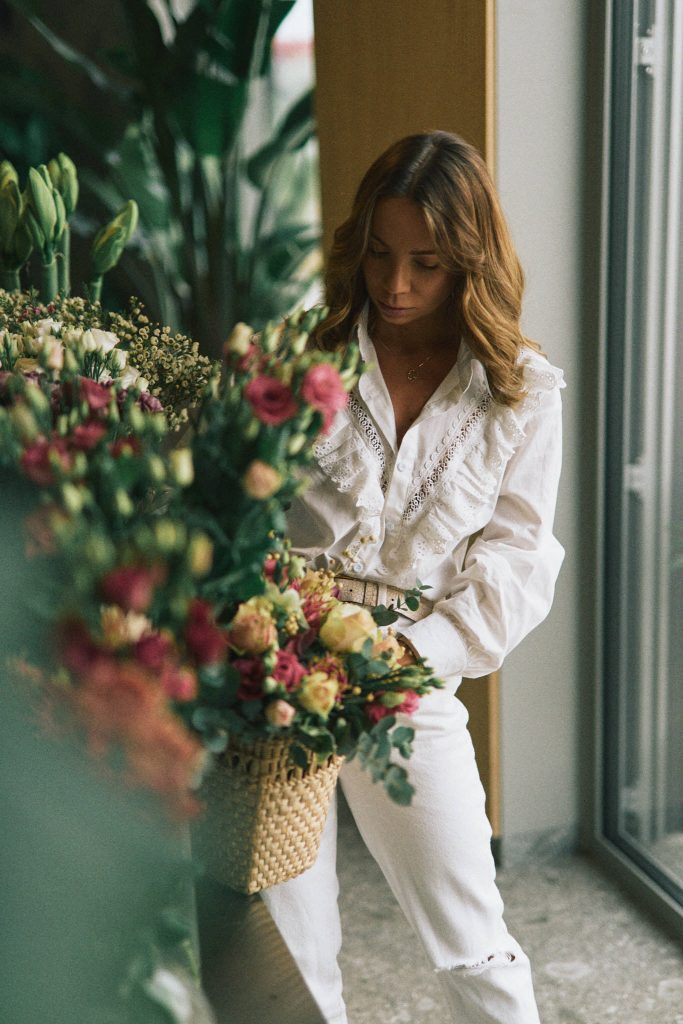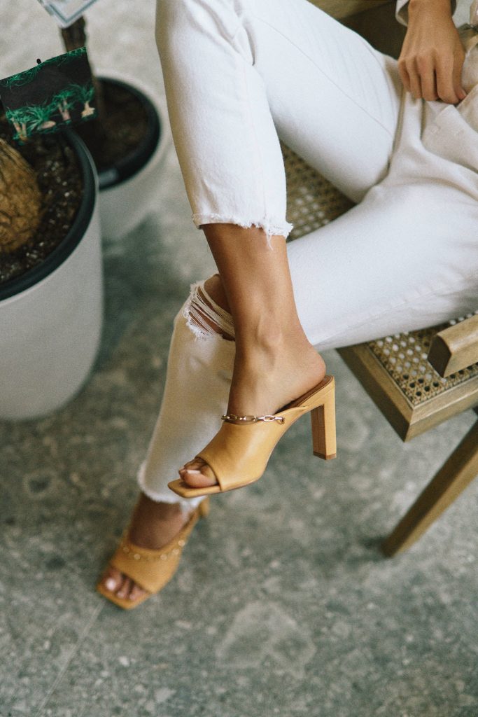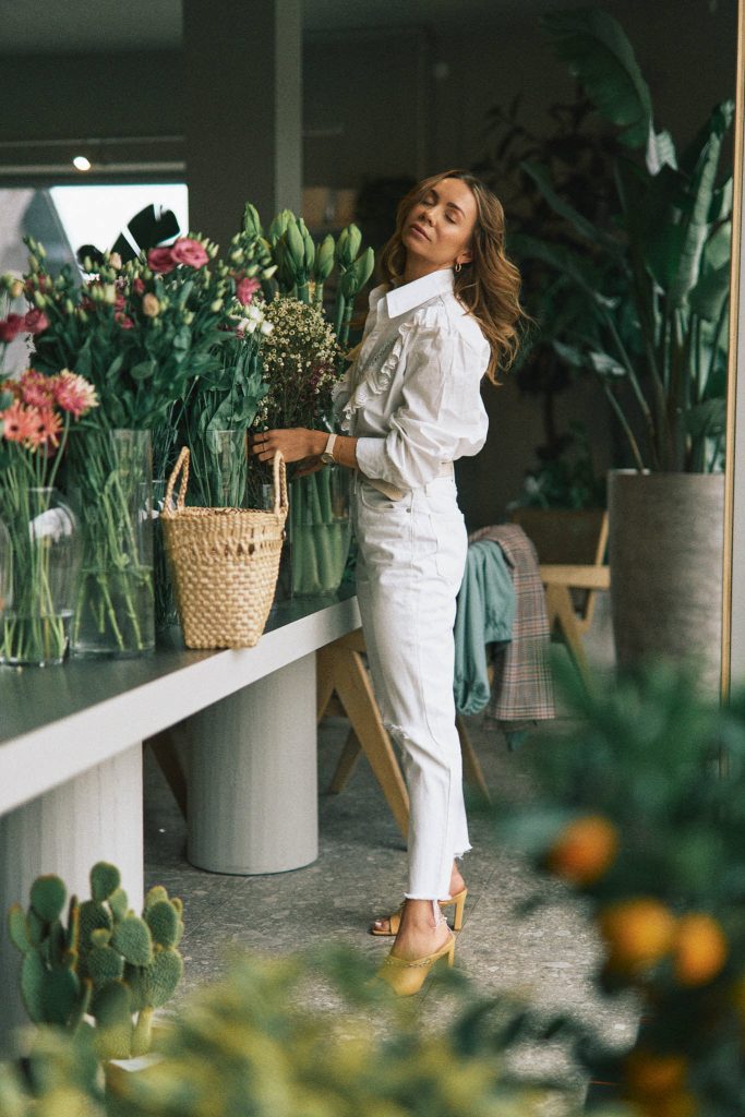 Biała koszula z dużym kołnierzem retro wygląda czarująco w połączeniu z klasycznymi jeansami lub spodniami typu mom fit w białym kolorze, takimi jak możecie zobaczyć w mojej stylizacji. Jeśli chodzi o spodnie, to wiecie już z cała pewnością jak bardzo uwielbiam ten model. Na stopach klapki na obcasie, trend, który swoją premierę miał w minionym roku, ale prztrwał i w tym sezonie.